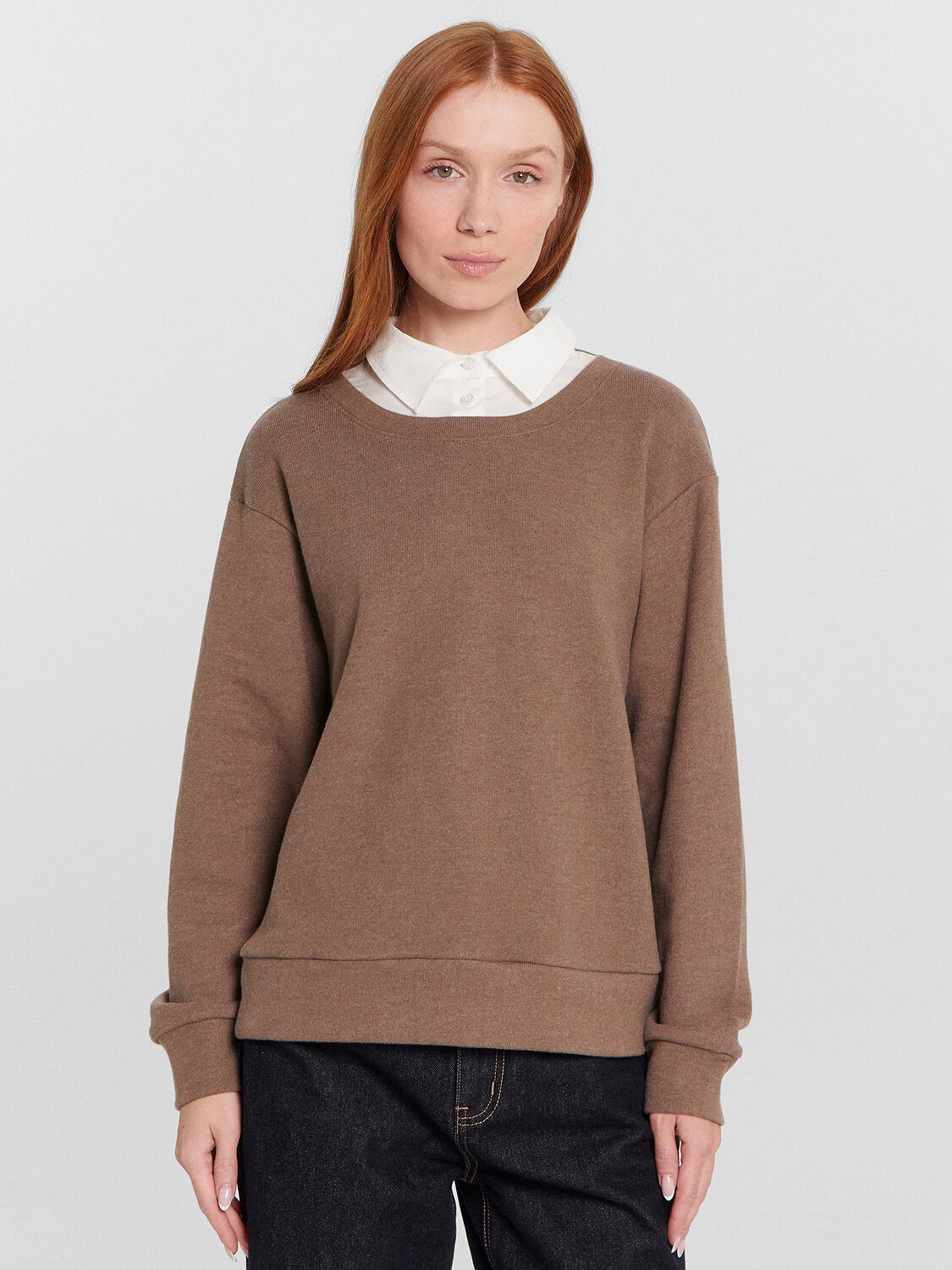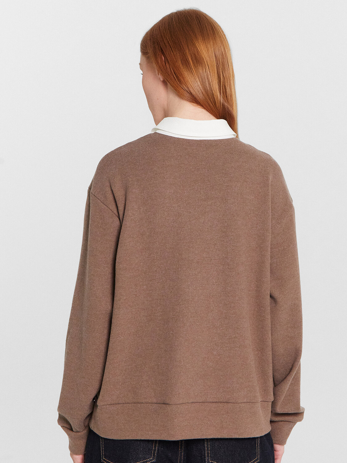 Женский джемпер свободного кроя выполнен из нежного материала селаник, который славится своей мягкостью и теплотой. Этот материал также отличается высокой износостойкостью и легкостью в уходе, что делает его идеальным выбором для повседневной одежды. Горловина круглой формы с воротником, имитирующим рубашку, и застежкой на пуговицу придает джемперу оригинальный и стильный вид. Длинные рукава со спущенной линией плеча и манжетами обеспечивают свободу движений и добавляют образу расслабленности и комфорта.