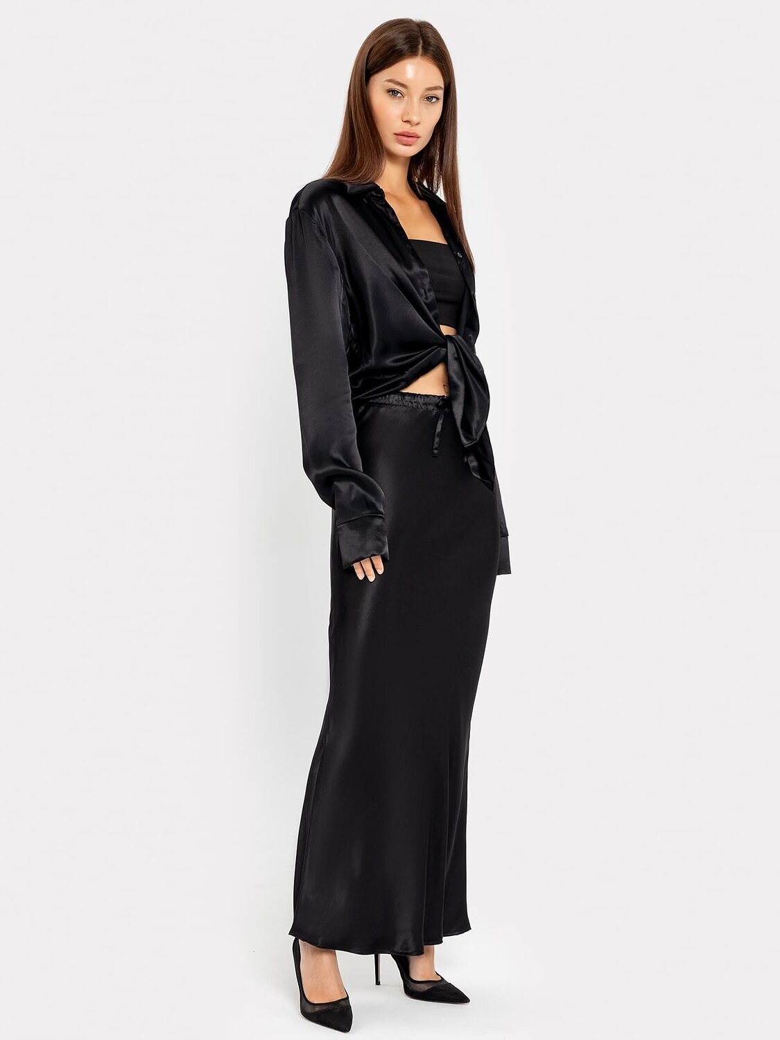 Блузка женская прямого силуэта из сатиновой ткани. Горловина круглой формы, в горловину втачан стояче-отложной воротник. Центральная застежка на пуговицы.