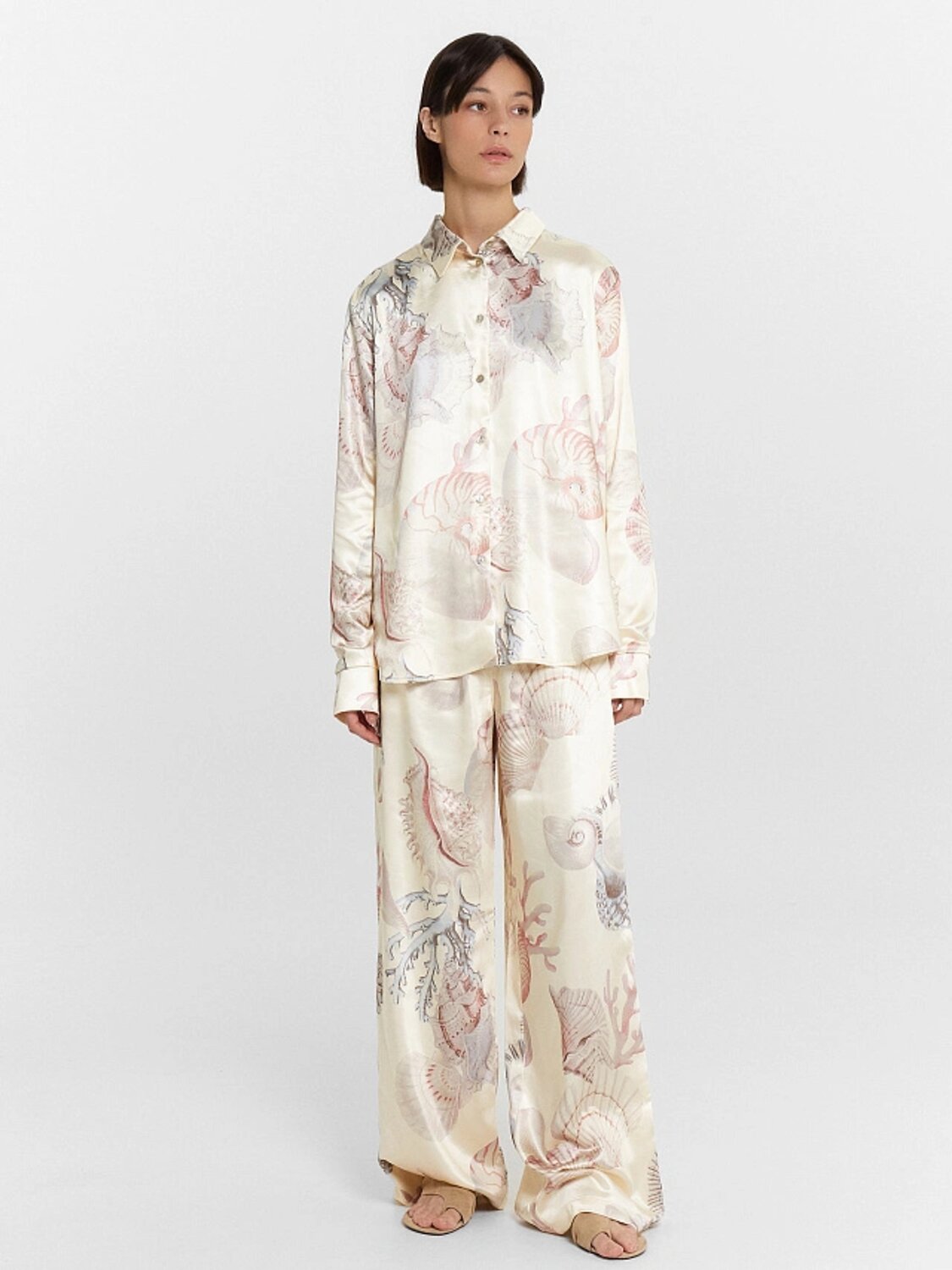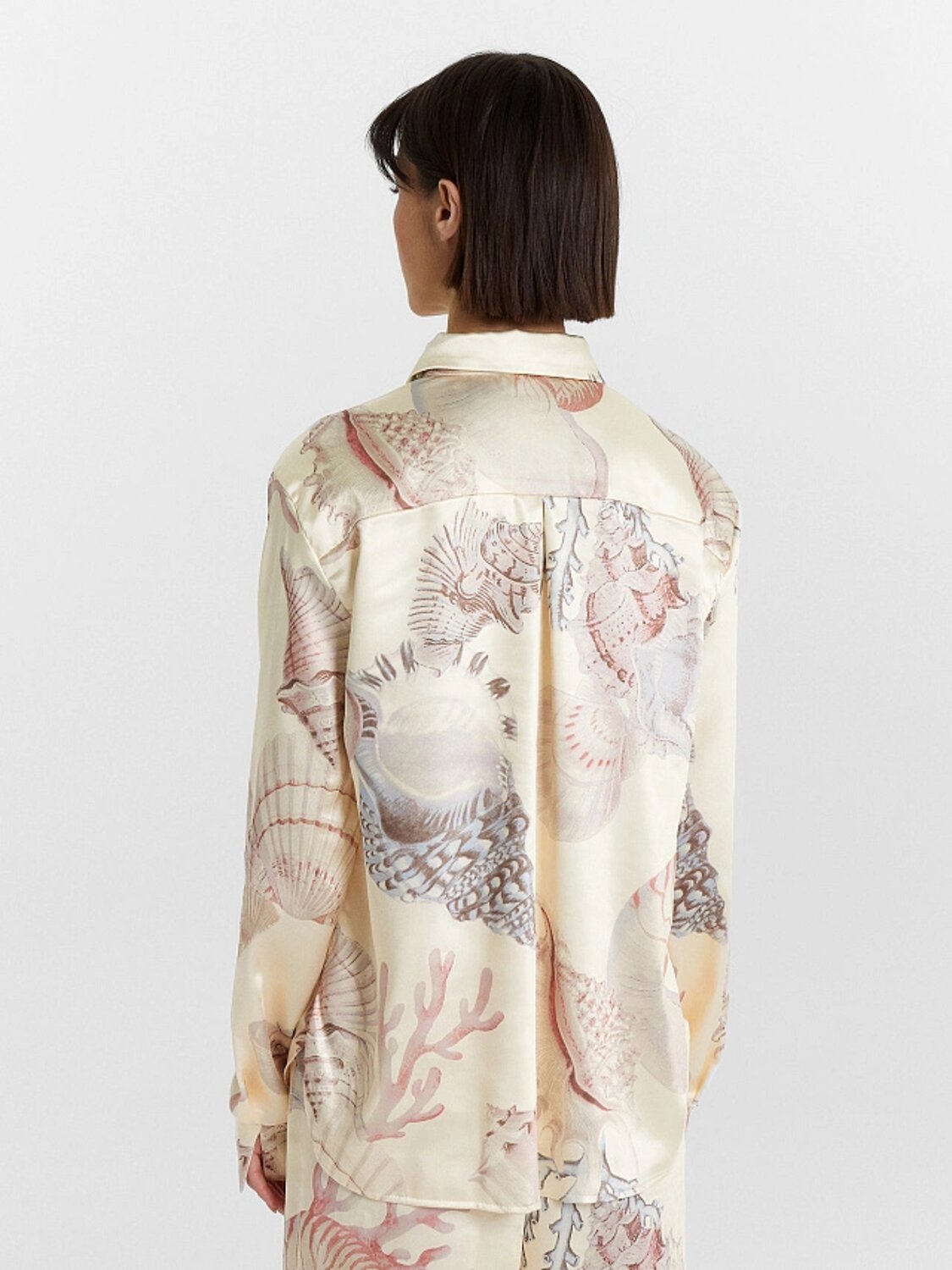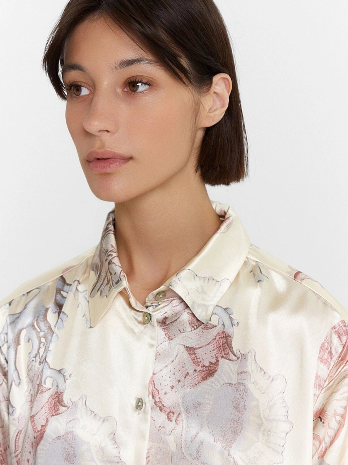 Блузка женская прямого силуэта из сатиновой ткани. Горловина круглой формы, в горловину втачан стояче-отложной воротник. Центральная застежка на пуговицы.