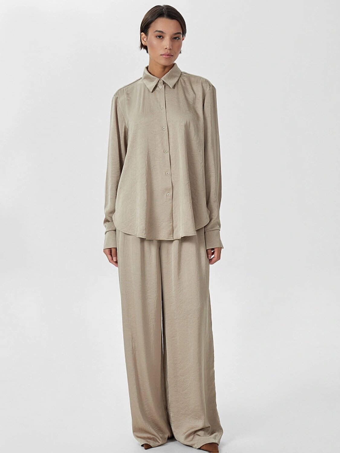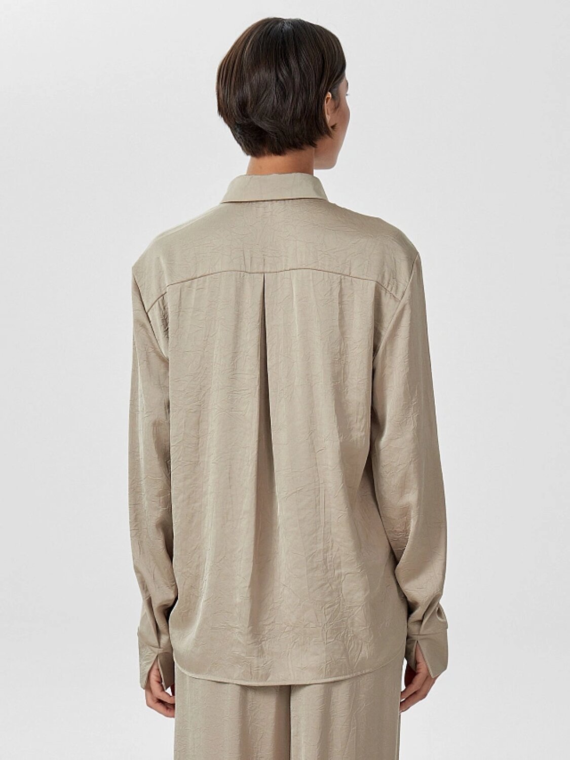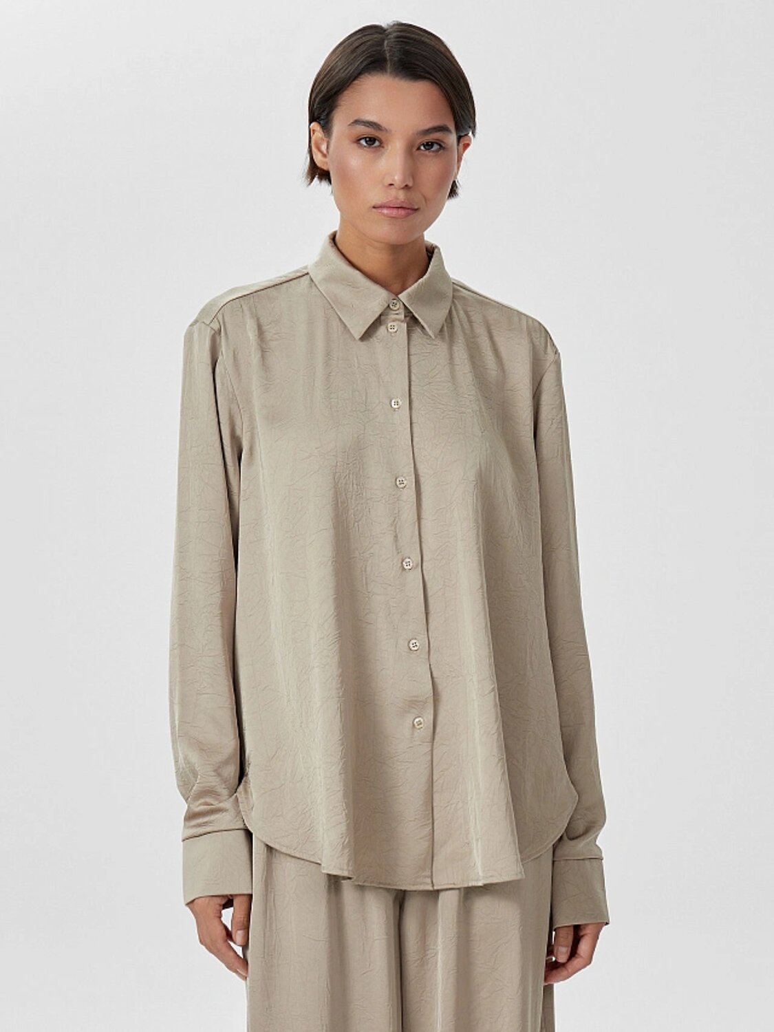 Блузка женская прямого силуэта из сатиновой ткани. Горловина круглой формы, в горловину втачан стояче-отложной воротник. Центральная застежка на пуговицы.