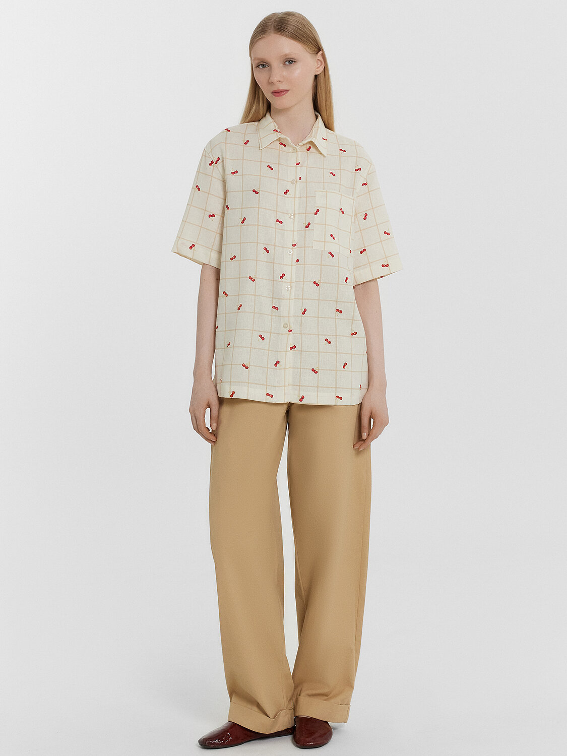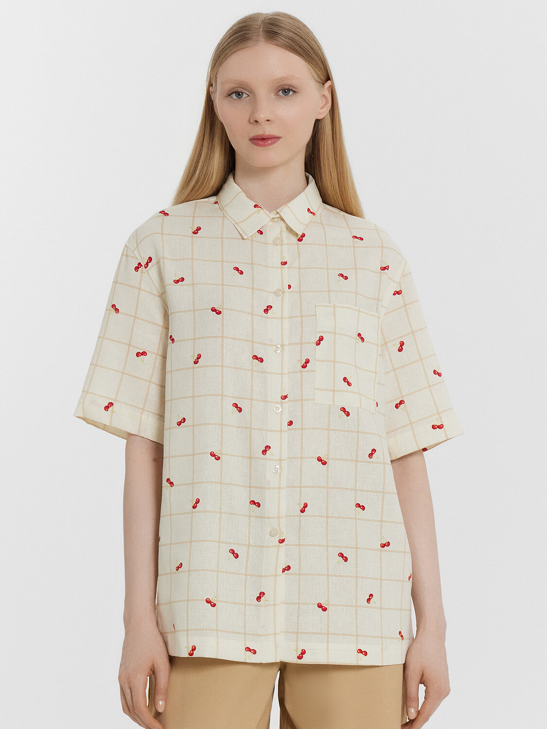 Блузка женская свободного силуэта из ткани. Блузка с цельнокроеной планкой и центральной застежкой на пуговицы. На левой детали переда накладной карман. Горловина круглой формы с рубашечным воротником. Плечо спущено, пройма углублена. Рукав втачной, короткий. Низ рубашки прямой.