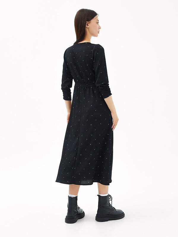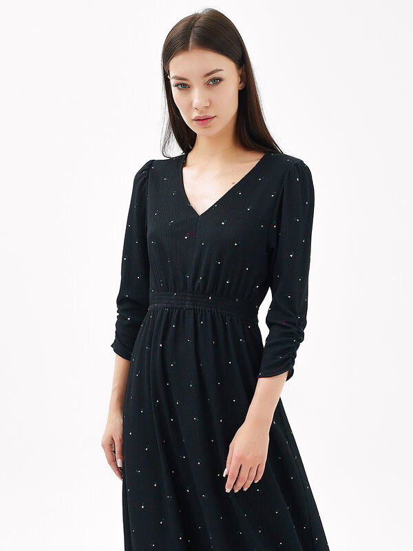 Платье полуприлегающего силуэта из ткани рошель. Горловина V-образной формы. Платье отрезное по талии, с эластичной тесьмой внутри. По эластичной тесьме проложены отделочные строчки. По детали переда средний шов. Детали спинки со средним швом. Рукав втачной, длинный. По окату слегка присборен. Длина рукава 3\4, по низу рукава настрочена эластичная тесьма которая делает сборку. Низ платья расширяется к низу. Длина платья ниже колена.