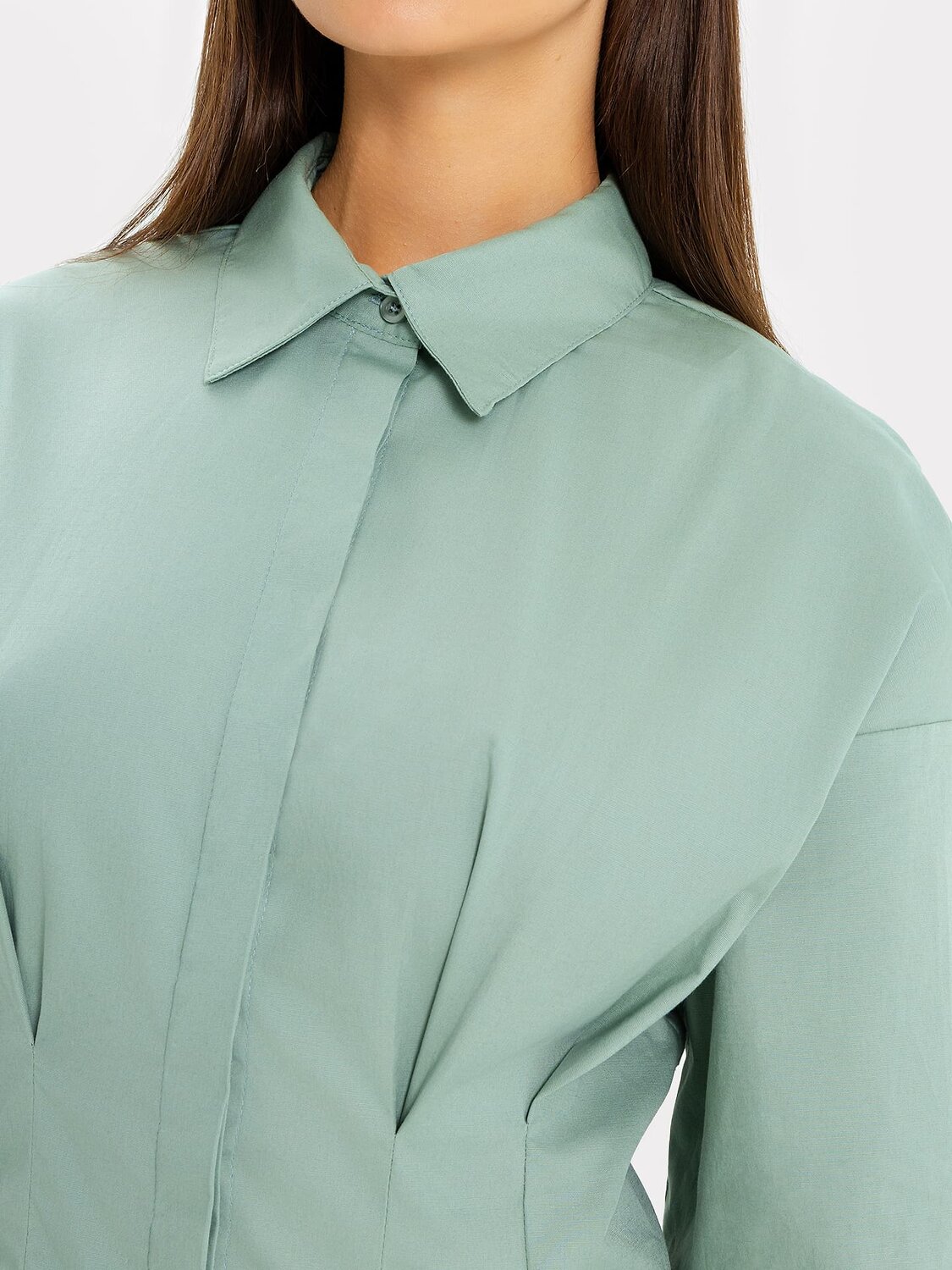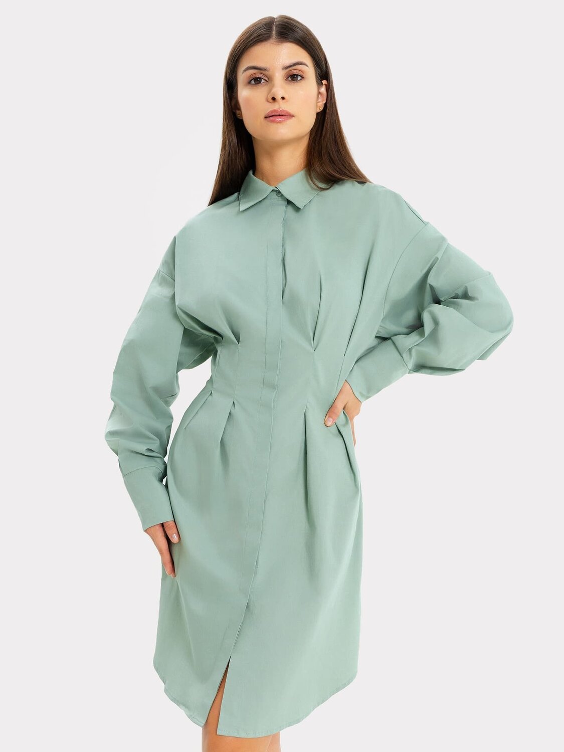 Текстильное платье мини женское полуприлегающего силуэта с фигурным низом. Перед с центральной застежкой на пуговицы. Горловина круглой формы с воротником-стойкой. Спереди и сзади заложены складки, подчеркивающие талию. Линия плеча спущена, длинные рукава заканчиваются широкими манжетами.