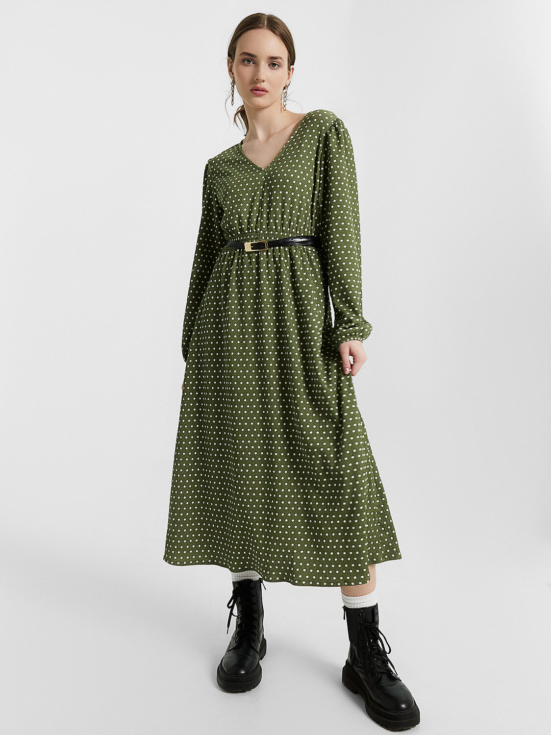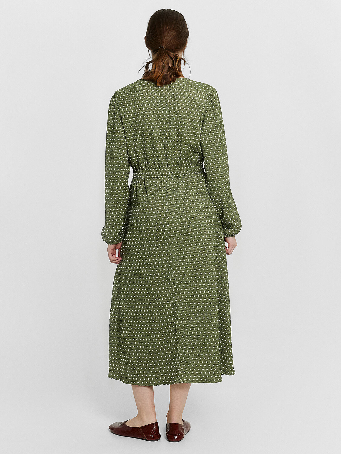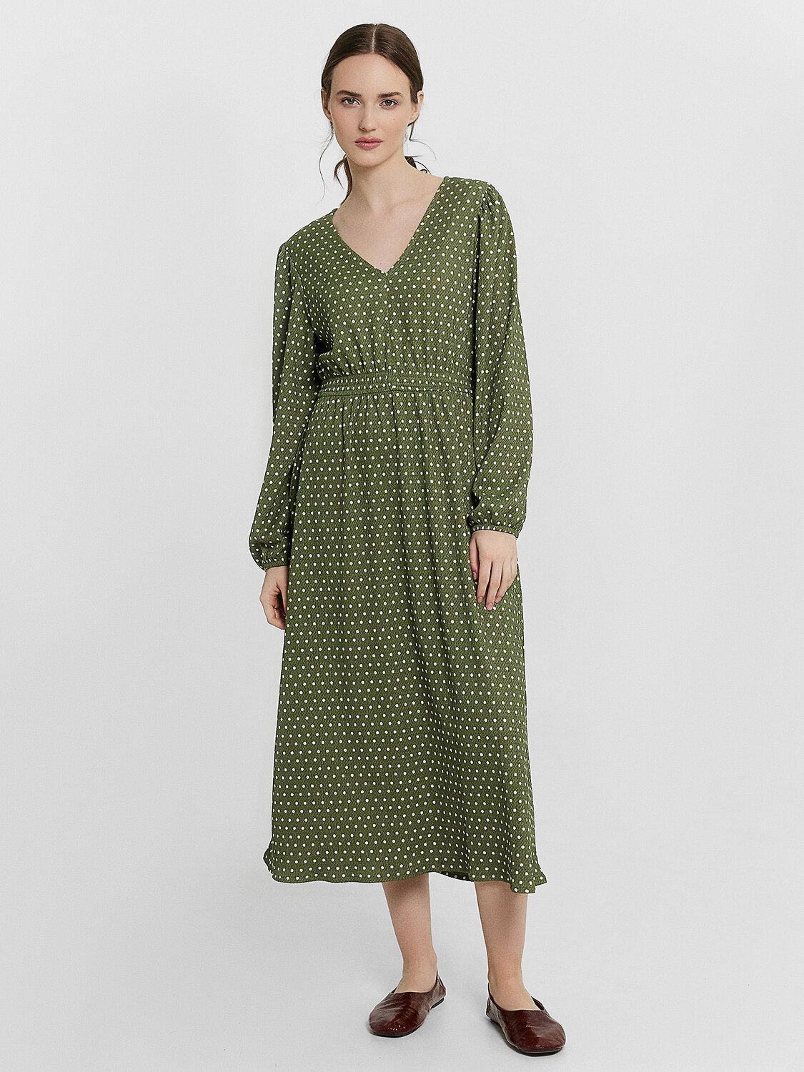 Платье полуприлегающего силуэта из ткани рошель. Горловина V-образной формы. Платье отрезное по талии, с эластичной тесьмой внутри. По эластичной тесьме проложены отделочные строчки. По детали переда средний шов. Детали спинки со средним швом. Рукав втачной, длинный. По окату слегка присборен. Длина рукава 3\4, по низу рукава настрочена эластичная тесьма которая делает сборку. Низ платья расширяется к низу. Длина платья ниже колена.