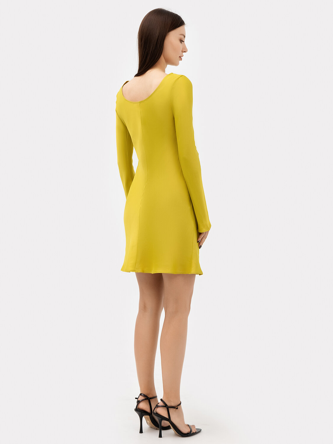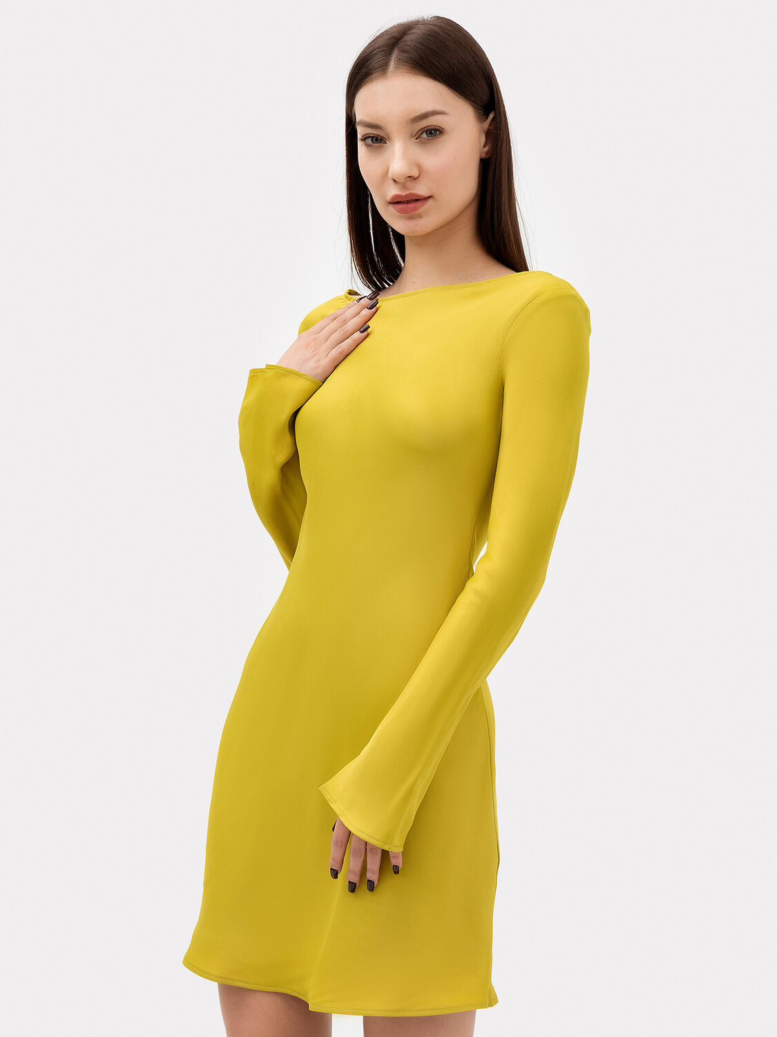 в чистый край. Горловина спинки более вырезана. Рукав втачной длинный, к низу рукав расширяется. Платье длиной выше колена.
