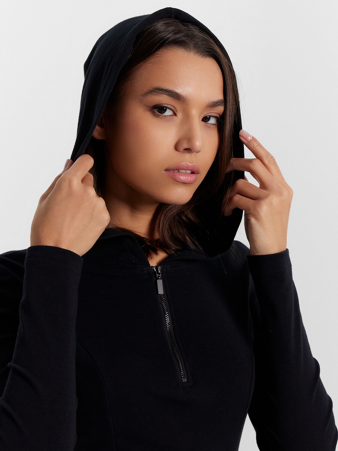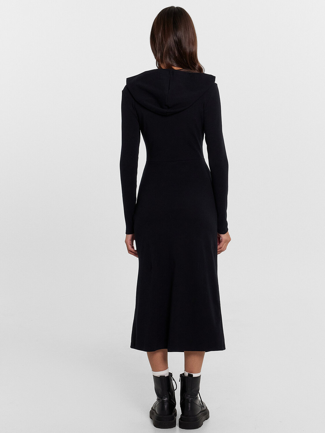 Платье женское прилегающего силуэта, длиной миди. Горловина круглой формы, в горловину втачан капюшон со средним швом. Деталь переда с рельевами и центральной застежкой на молнию. Платье отрезное по талии. Рукав втачной, длинный, узкий. Низ платья прямой, со сборкой по рельефу на эластичную тесьму (жилка 6мм WT4-6) и разрезом по низу. Усилитель разреза- лента репсовая шир.7мм, SFLR-2. Нижний срез полатья и рукавов обработан швом вподгибку.