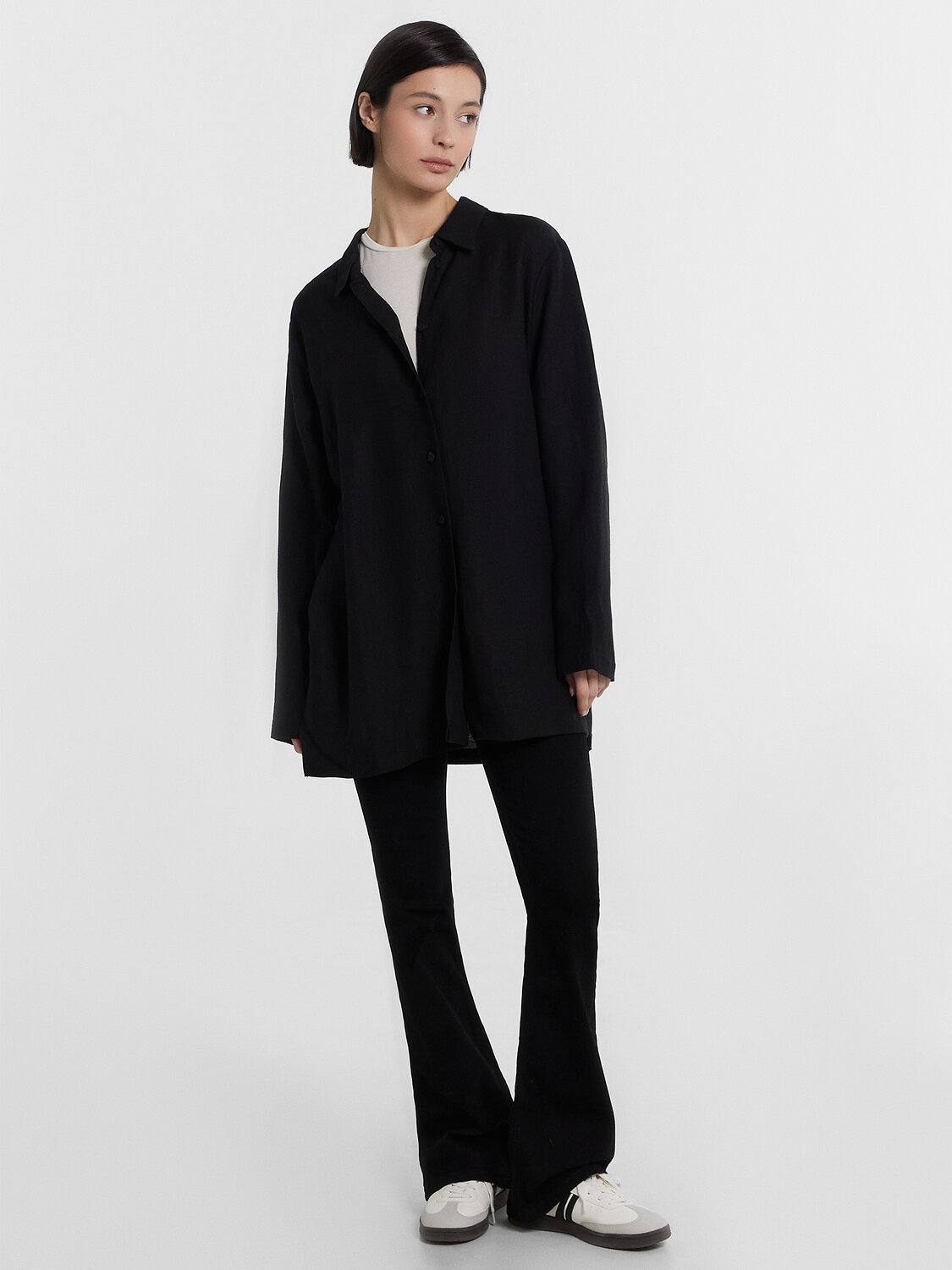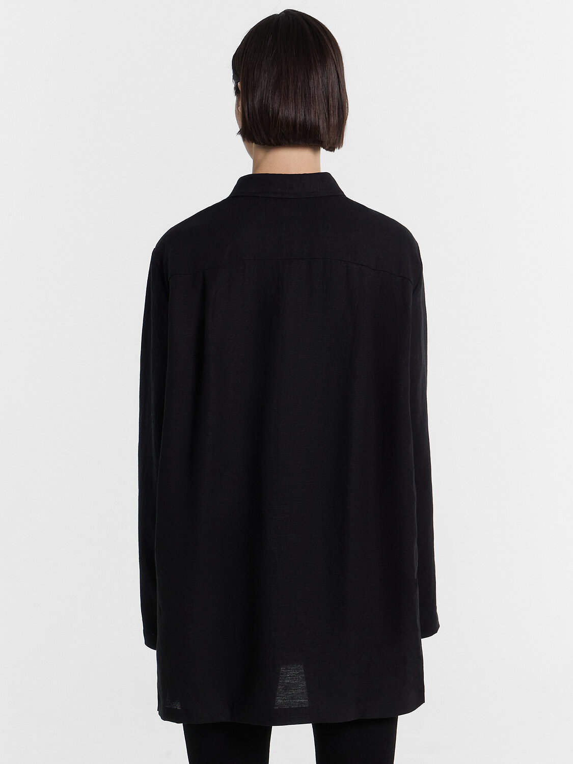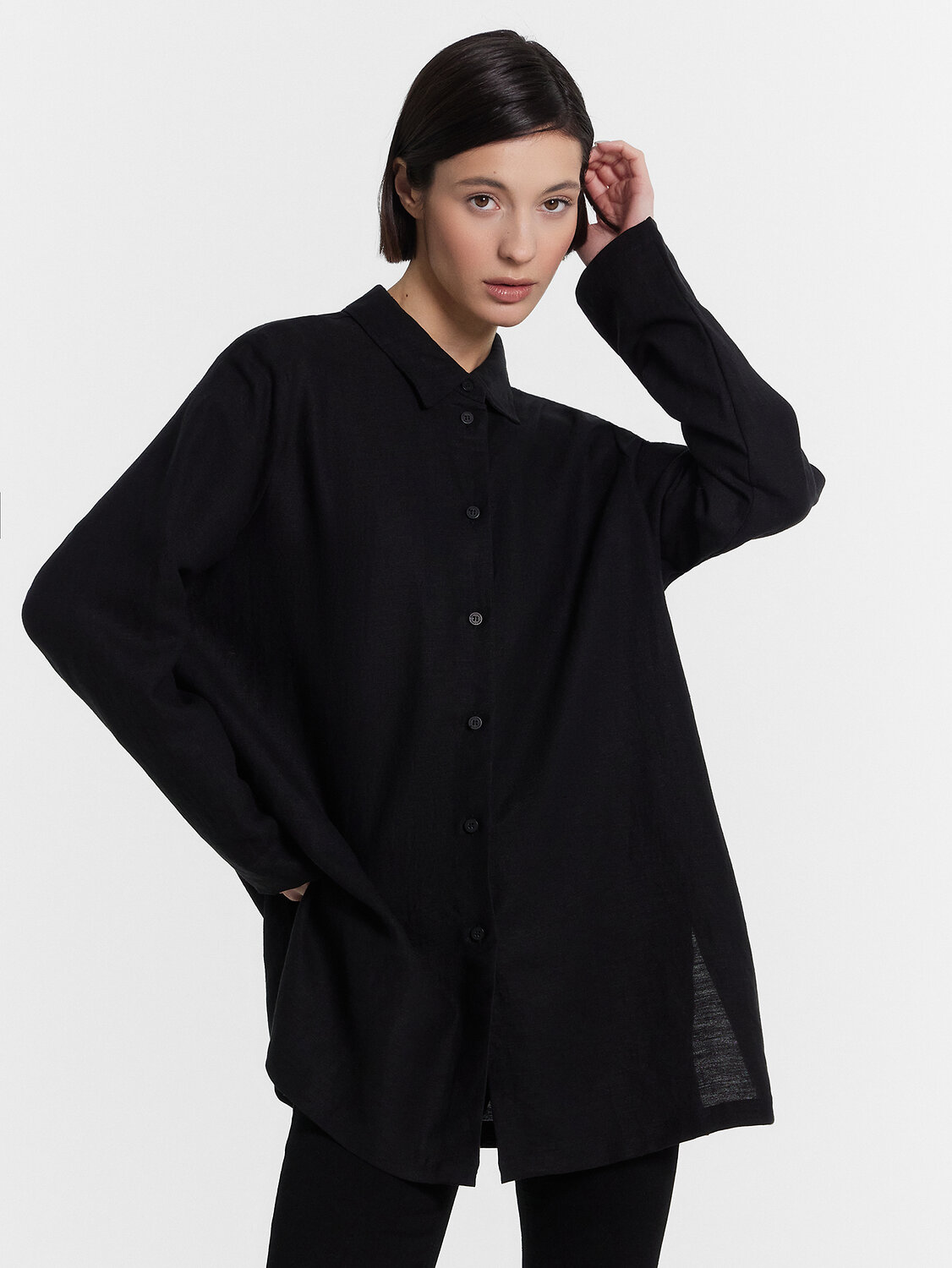 Блузка женская удлиненная прямого свободного силуэта из ткани. Блузка с цельнокроеной планкой и центральной застежкой на пуговицы.