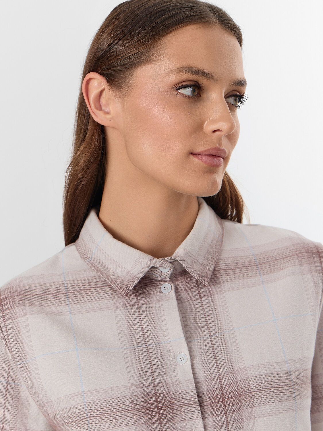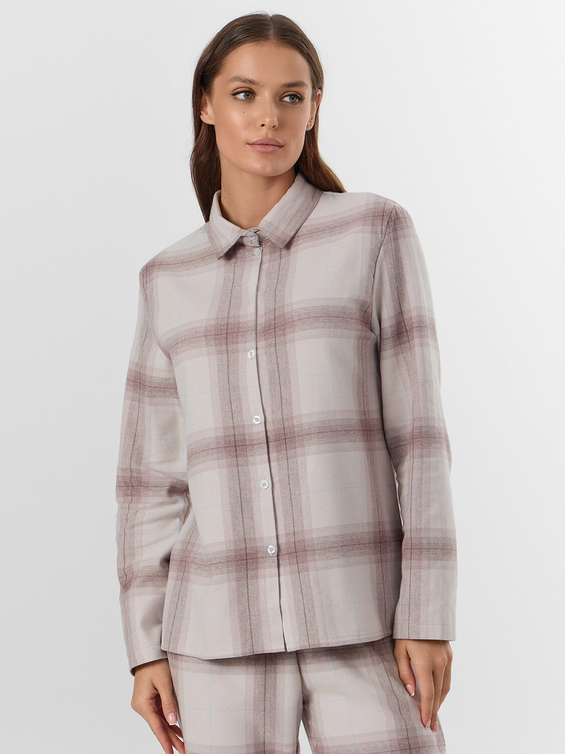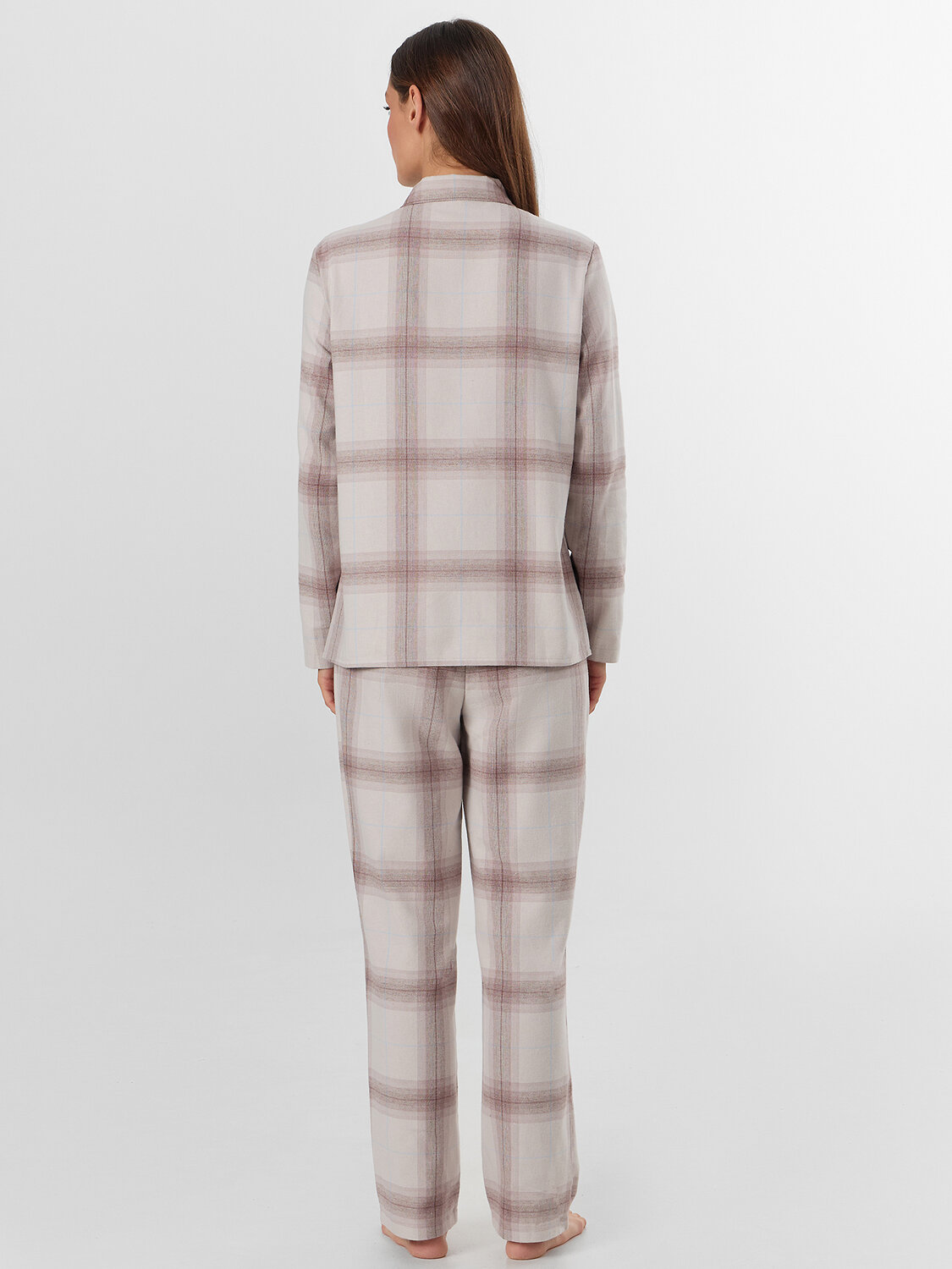 Брюки с широким эластичным поясом мягко сидят на талии, не оставляя следов, а клетчатый рисунок придает образу теплоту и домашний шарм. Этот комплект подойдет для сна, утреннего кофе или отдыха с книгой — он сочетает практичность и стиль.