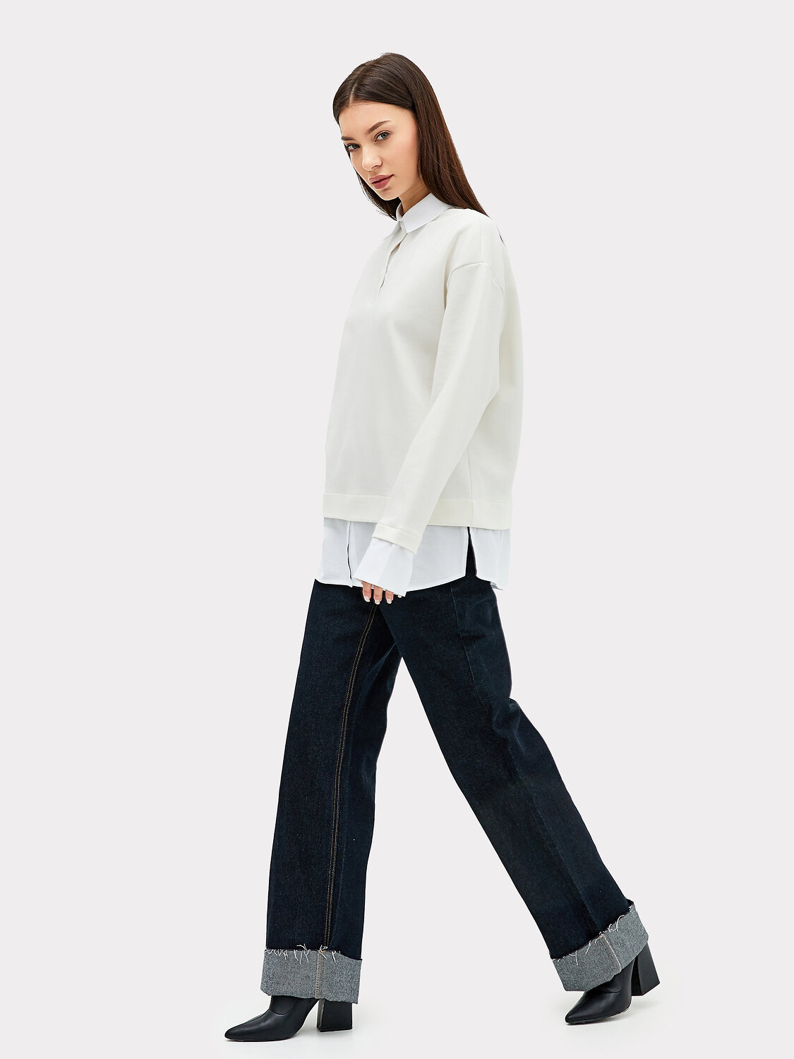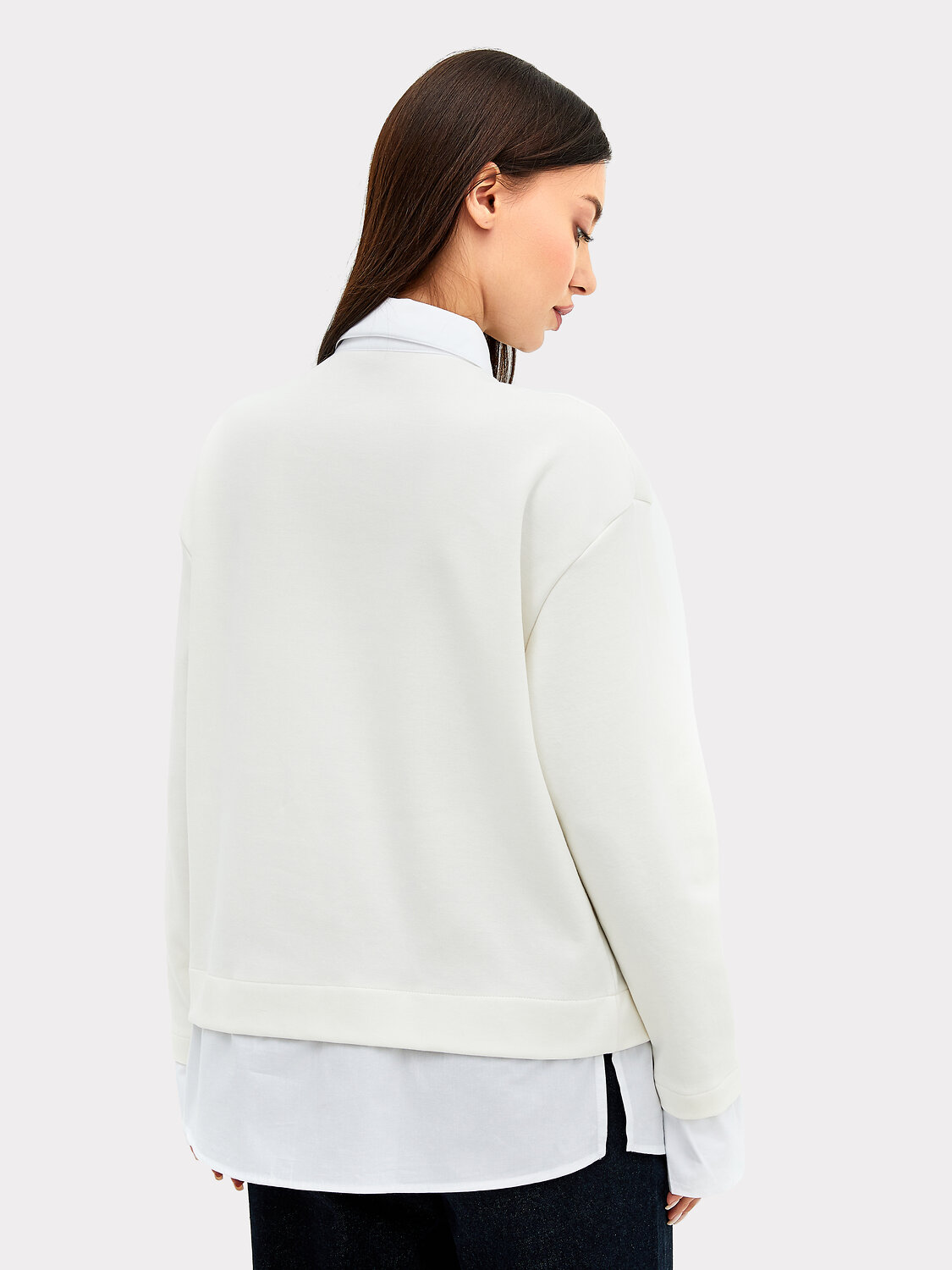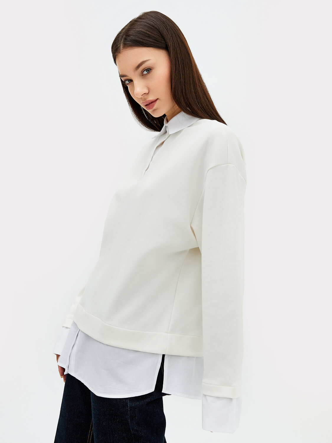Уютный джемпер свободного кроя из плотного трикотажного полотна - интерлока с отделочными деталями из ткани - поплина. Отделочные детали имитируют выправленную из-под низа изделия рубашку. В боковых швах выполнены разрезы. Горловина обработана отделочным элементом - стояче-отложным воротником с отрезной стойкой. Воротник выполнен из отделочного полотна. На передней детали есть застежка-планка на три рубашечных пуговицы на два прокола на застежке-планке. Плечо спущено, пройма углублена, рукав втачной длинный с манжетами. Стильная и комфортная модель для создания оригинальных образов на каждый день!