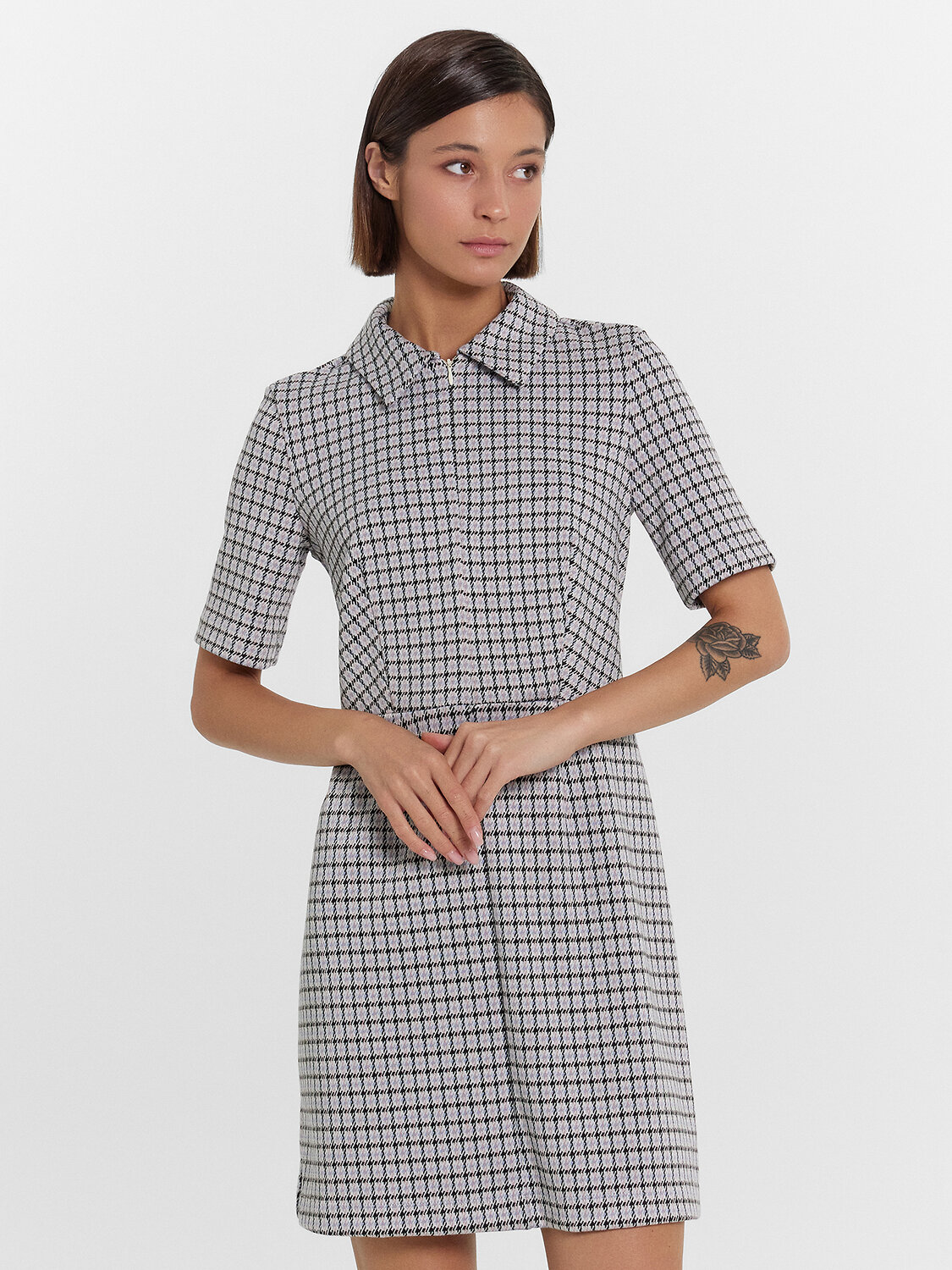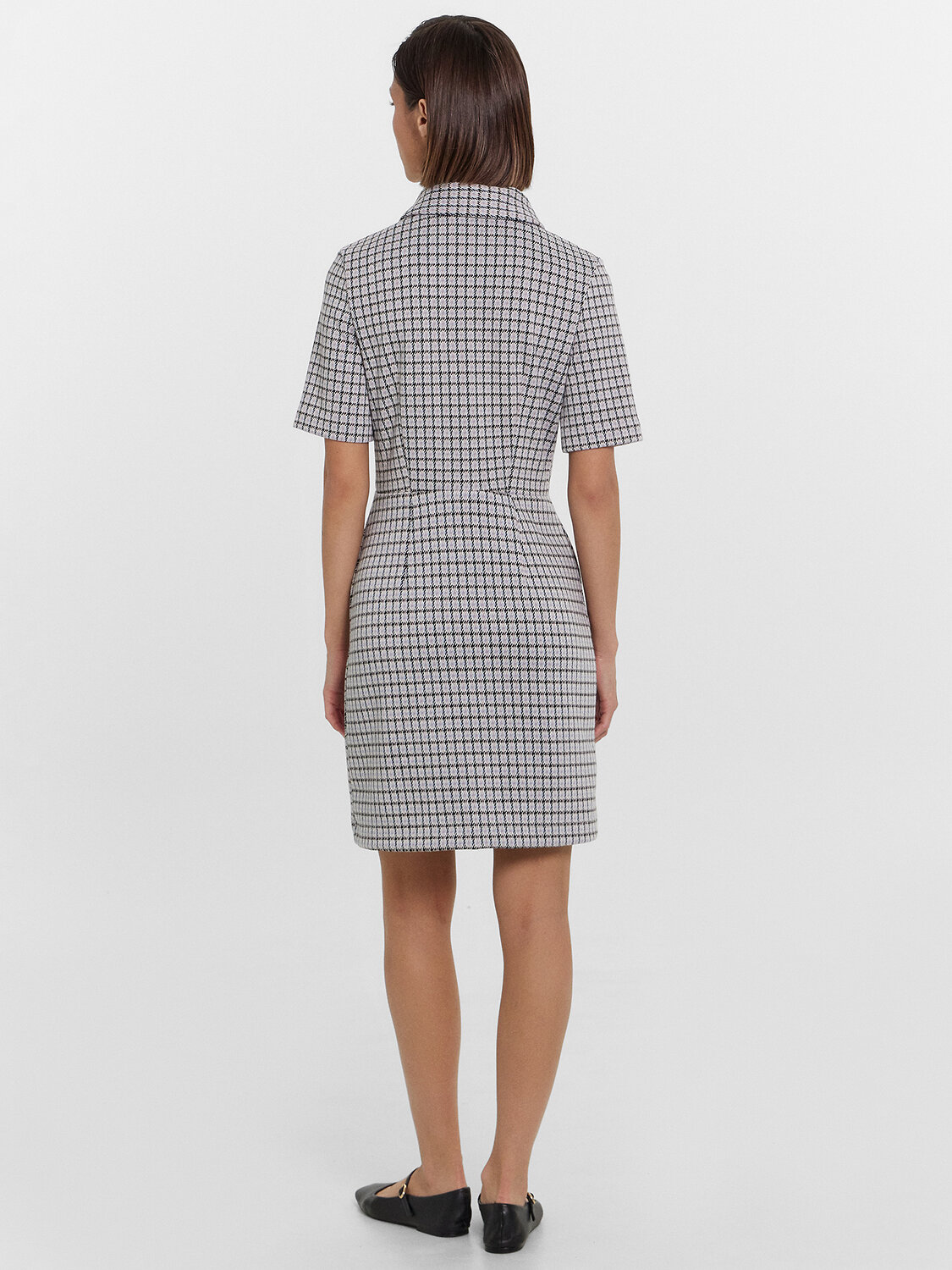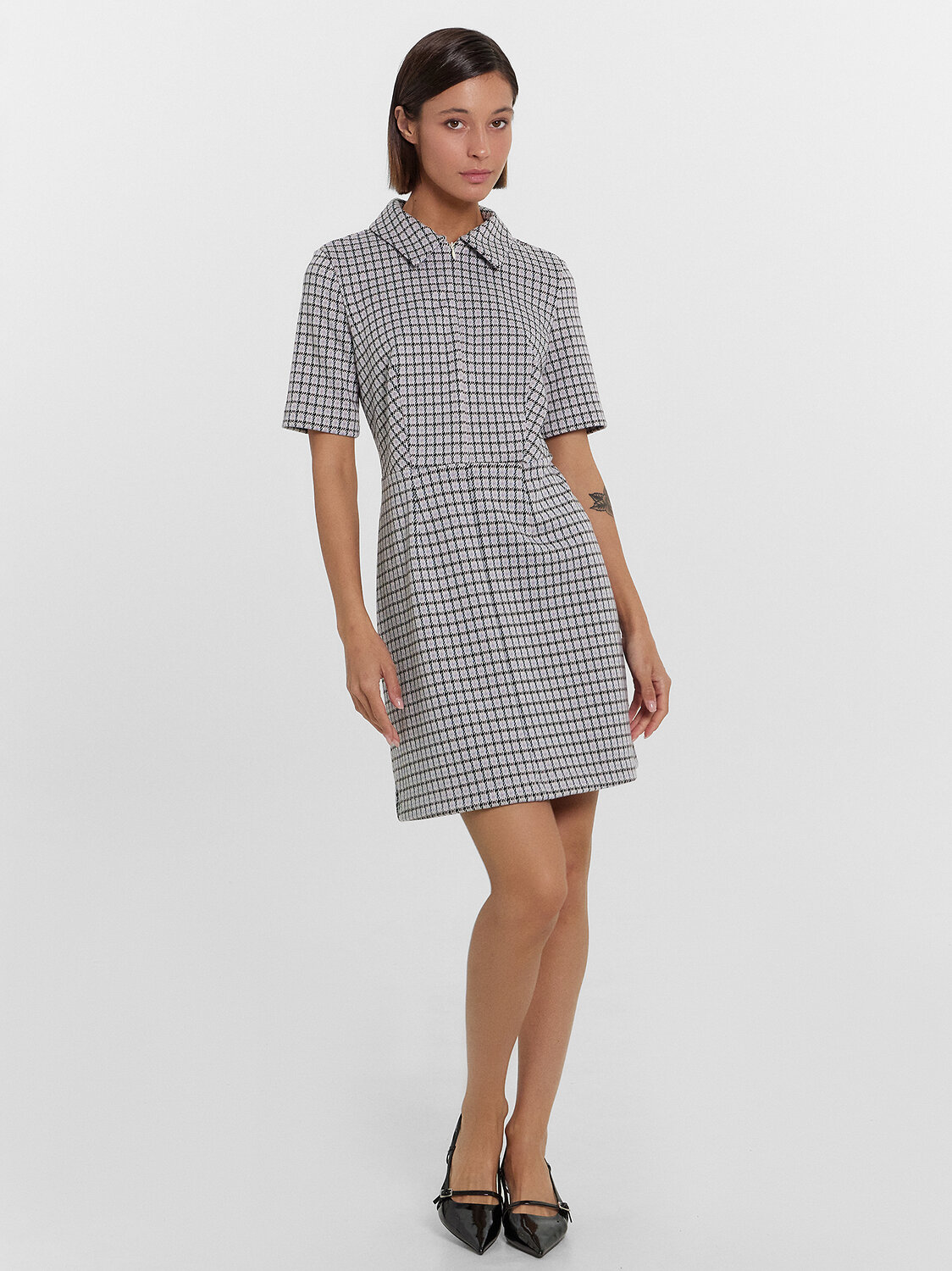 Платье женское полуприлегающего силуэта из трикотажного полотна академик. Горловина круглой формы, в горловину втачан стояче-отложной воротник из основного полотна. Рукав втачной, короткий. Платье отрезное по талии с центральным швом по переду. На верхней детали переда обработана застежка на потайную молнию в центральном шве. На передних и задних деталях вытачки. Платье длиной мини. Нижний срез платья и рукавов обработан швом вподгибку.