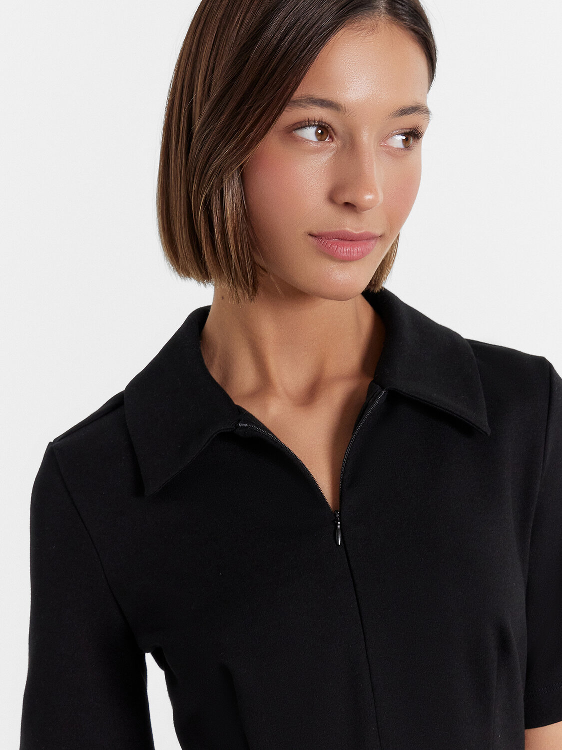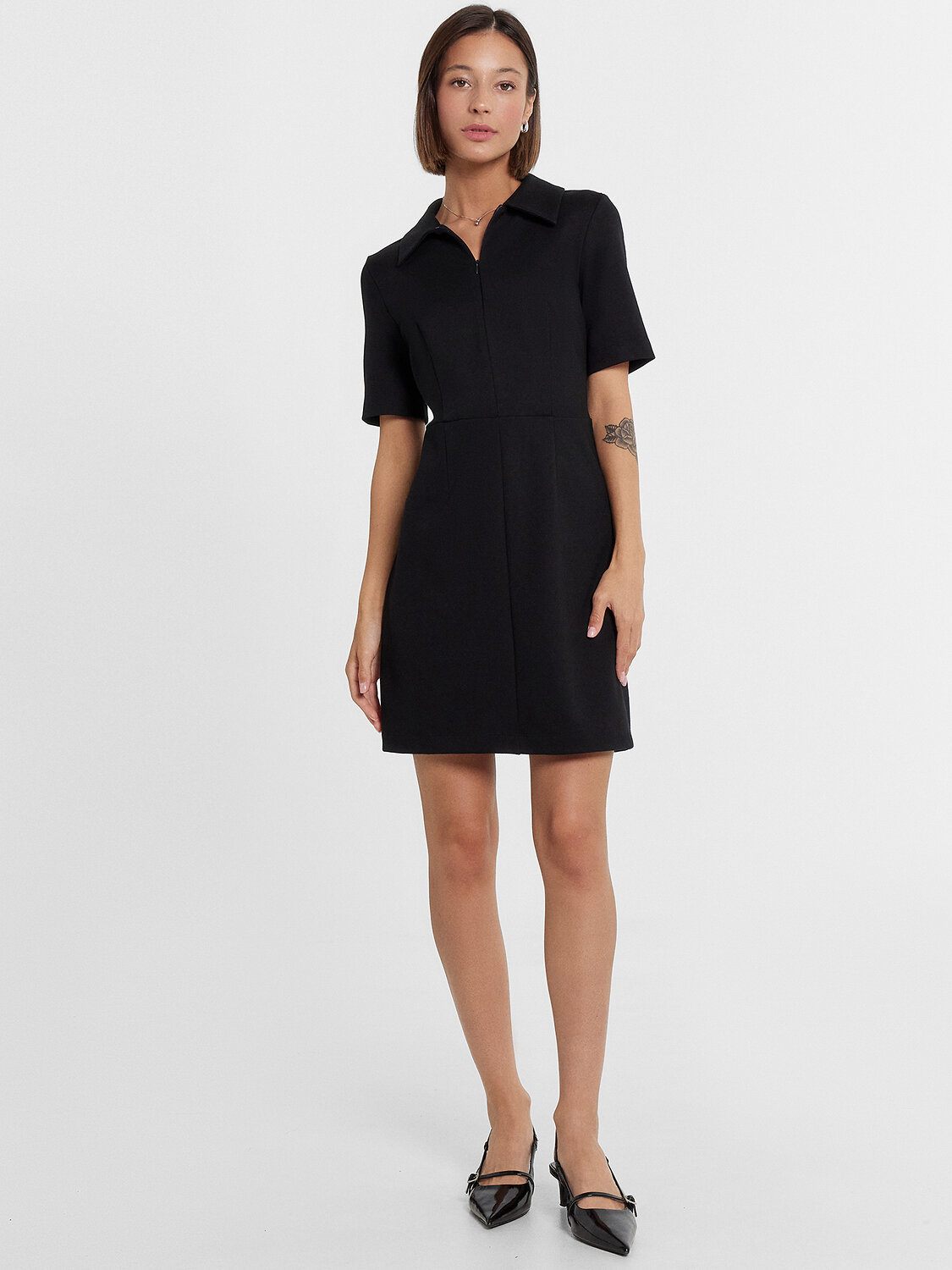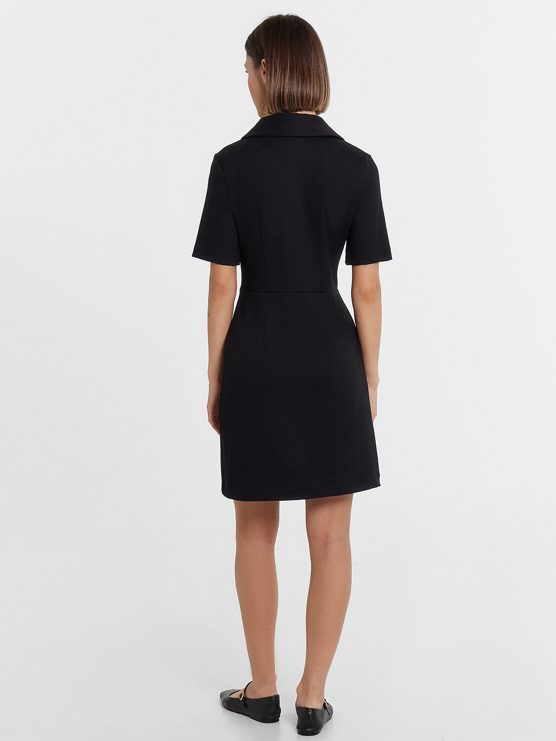 Платье женское полуприлегающего силуэта из трикотажного полотна академик. Горловина круглой формы, в горловину втачан стояче-отложной воротник из основного полотна. Рукав втачной, короткий. Платье отрезное по талии с центральным швом по переду. На верхней детали переда обработана застежка на потайную молнию в центральном шве. На передних и задних деталях вытачки. Платье длиной мини. Нижний срез платья и рукавов обработан швом вподгибку.