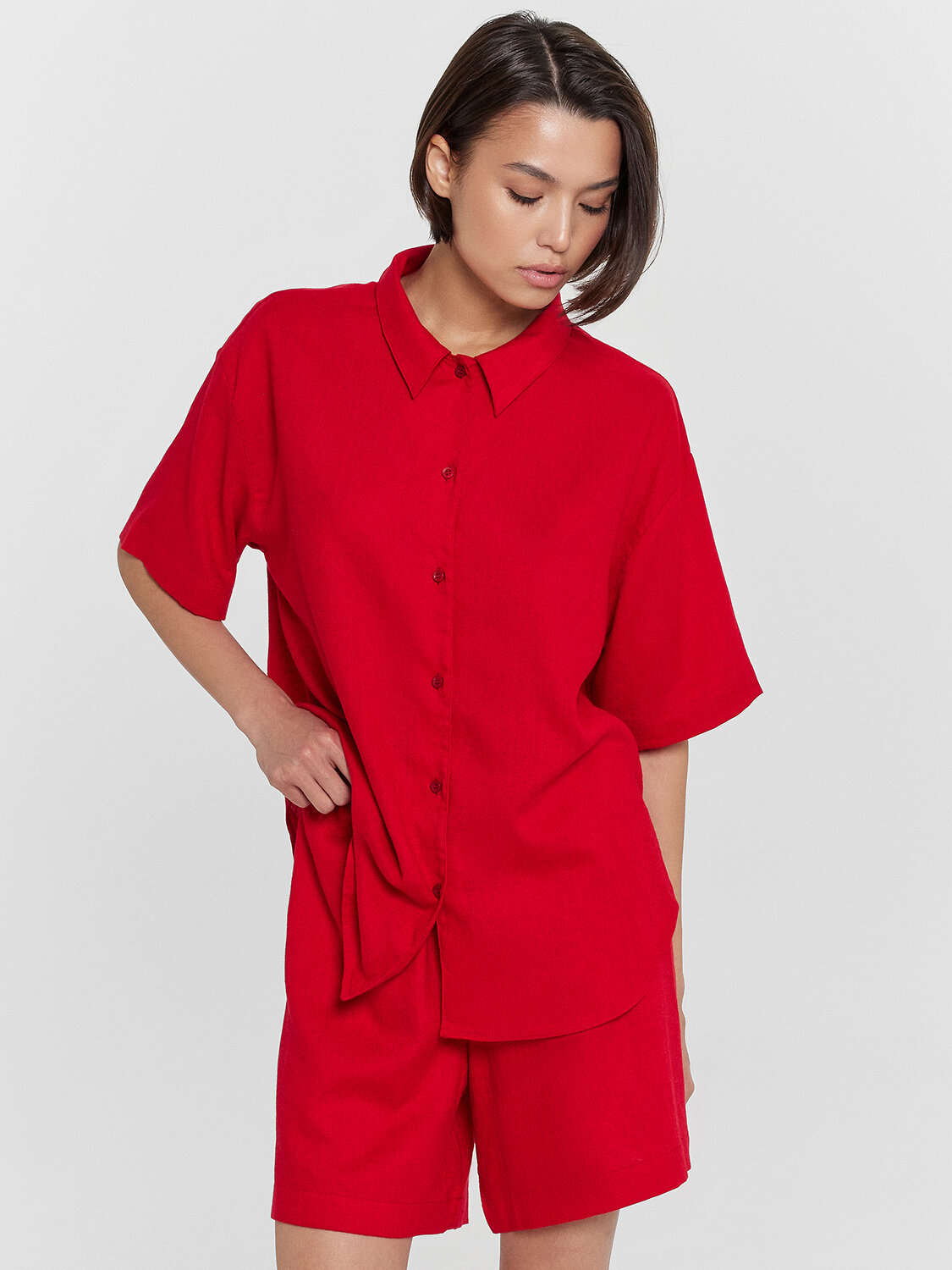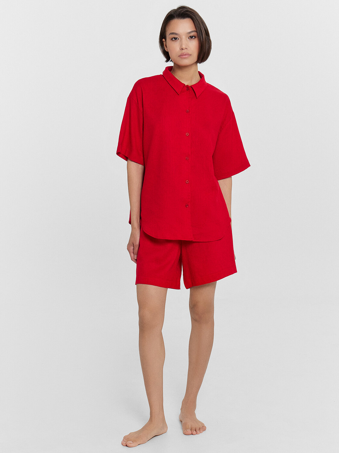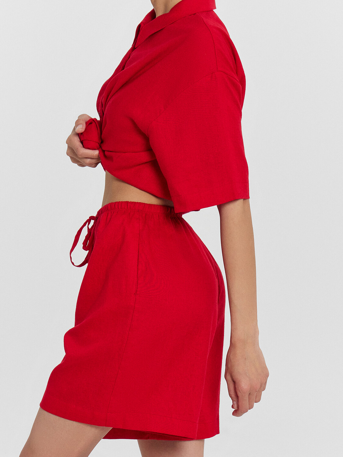 Комплект женский состоит из жакета и шорт. Жакет свободного силуэта, с воротником стойкой. Рукав втачной короткий, рукав обработан в подгибку. Жакет с центральной застежкой с петлями и пуговицами. Низ застрочен швом в подгибку. Шорты свободного силуэта, высокая посадка. Верх застрочен в подгибку с протянутым шнуром из основного полотна. В боковых швах карманы. Низ шорт обработан вподгибку.