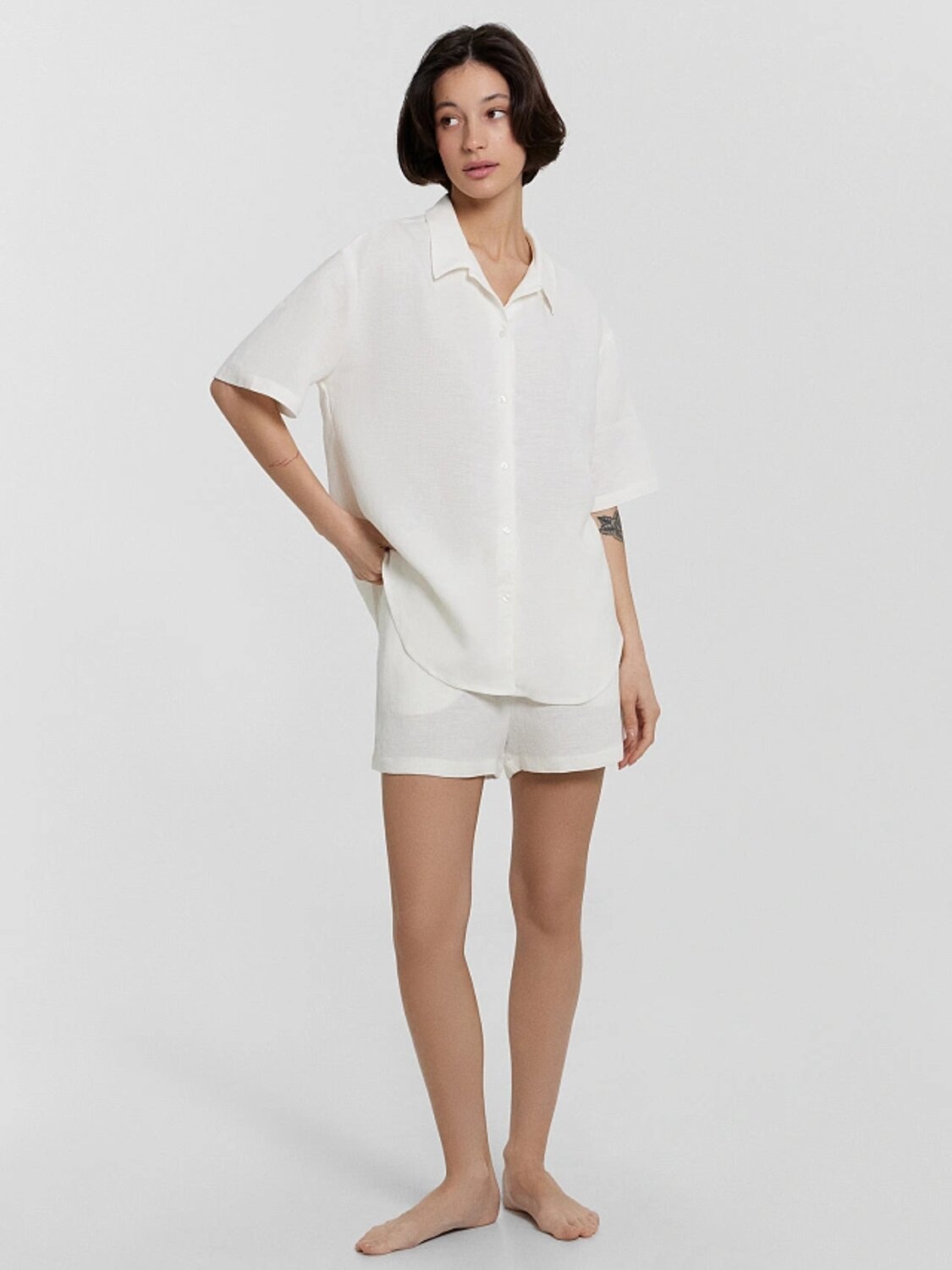 Женская пижама, выполненная из сочетания льна и вискозы. Она сочетает в себе стиль и комфорт, идеально подходя для повседневного ношения дома. Рубашка свободного силуэта с отложным воротником и короткими рукавами имеет центральную застежку на пуговицах, что обеспечивает удобство и легкость в носке. Шорты свободного кроя с высокой посадкой и карманами в боковых швах добавляют практичности и комфорта. Модель выполнена из натурального льна и вискозы. Такое сочетание материалов обеспечивает оптимальный комфорт и долговечность. Лён - это натуральный материал, который обладает отличными дышащими свойствами и дарит прохладу в жаркие дни. Вискоза, в свою очередь, добавляет мягкости и шелковистости, делая изделие особенно приятным к телу. Эта пижама станет вашим любимым выбором для уютных вечеров и расслабленного отдыха дома.