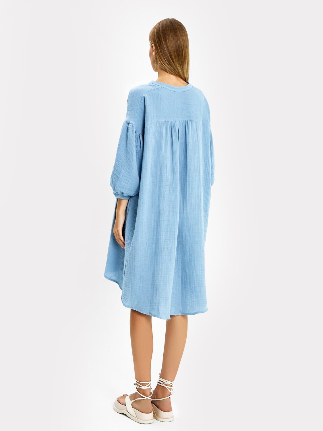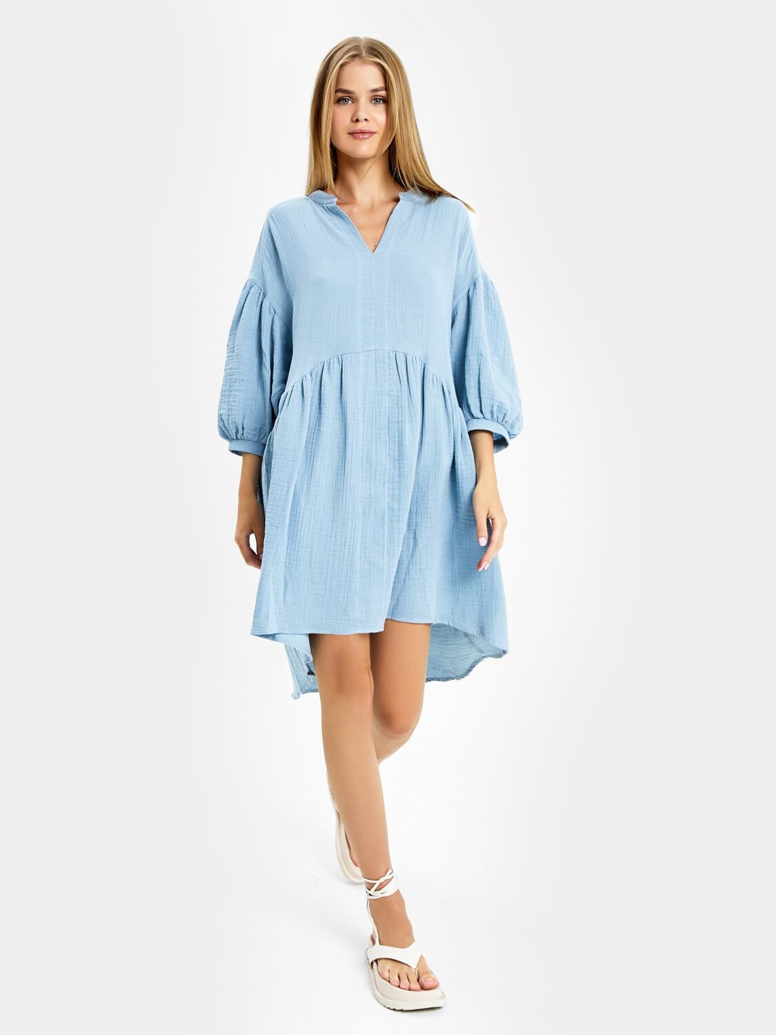 Платье женское свободного силуэта из ткани. Горловина V-образной формы. Стойка отрезная.
