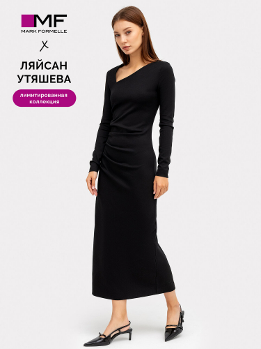 Платье прямое свободное, длиной миди. Горловина V-образной формы со стояче-отложным воротником. Плечо слегка спущено, рукав втачной, длинный. По низу рукавов отрезные манжеты с разрезами. Центральная застежка на петли и пуговицы. В боковых швах обработаны карманы. По бокам внизу обработаны разрезы. Нижний срез платья обработан швом вподгибку с закрытым срезом.