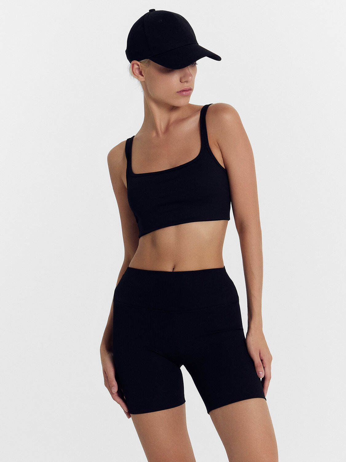 Шорты облегающего силуэта, с высокой посадкой. Длиной выше колена. Пояс отрезной фигурный. По шву сидения сзади сборка на эластичную тесьму 6мм (жилка тканая WT4-6). Шорты без боковых швов, с ластовицей. Нижний срез обработан швом вподгибку.