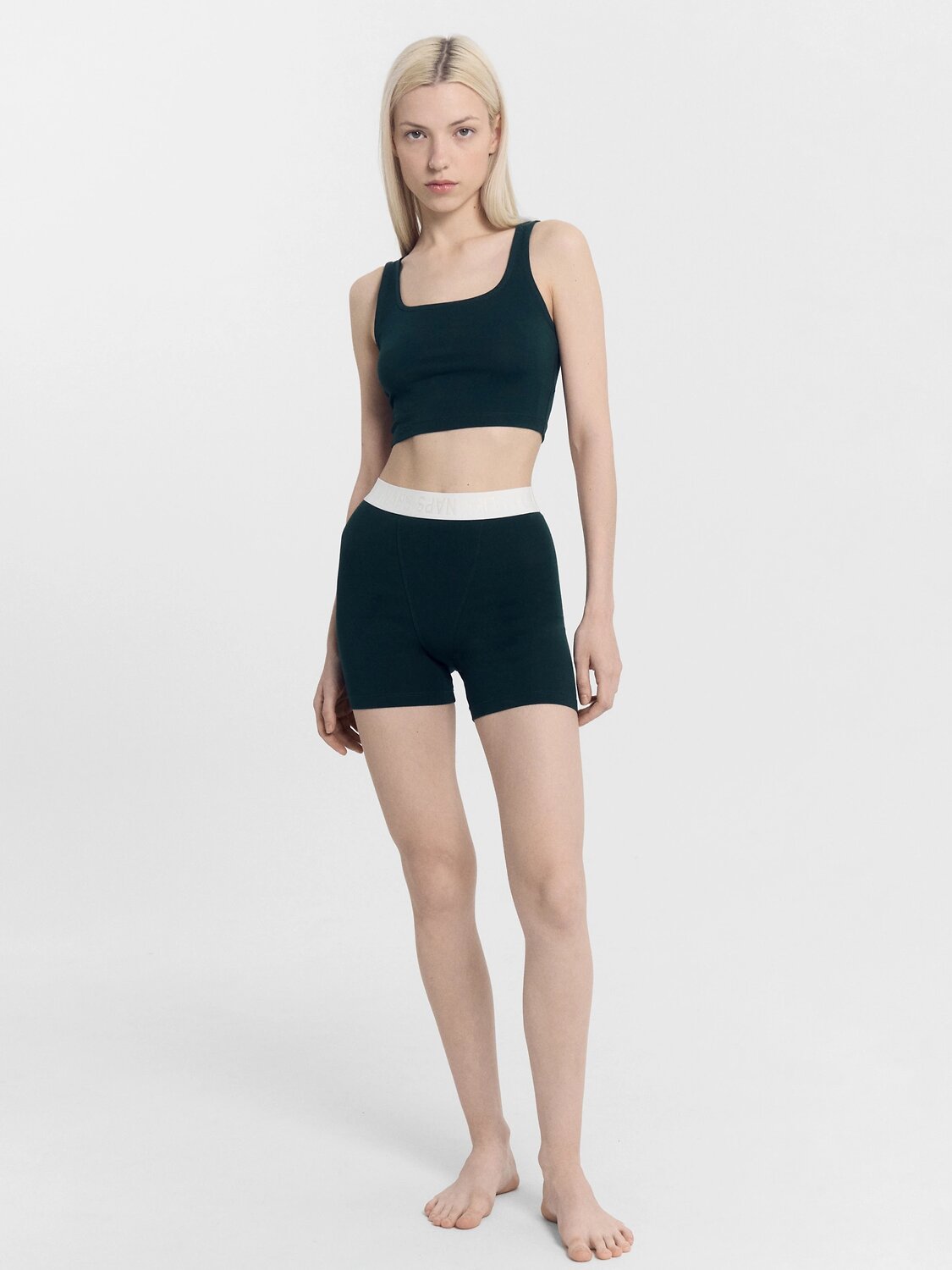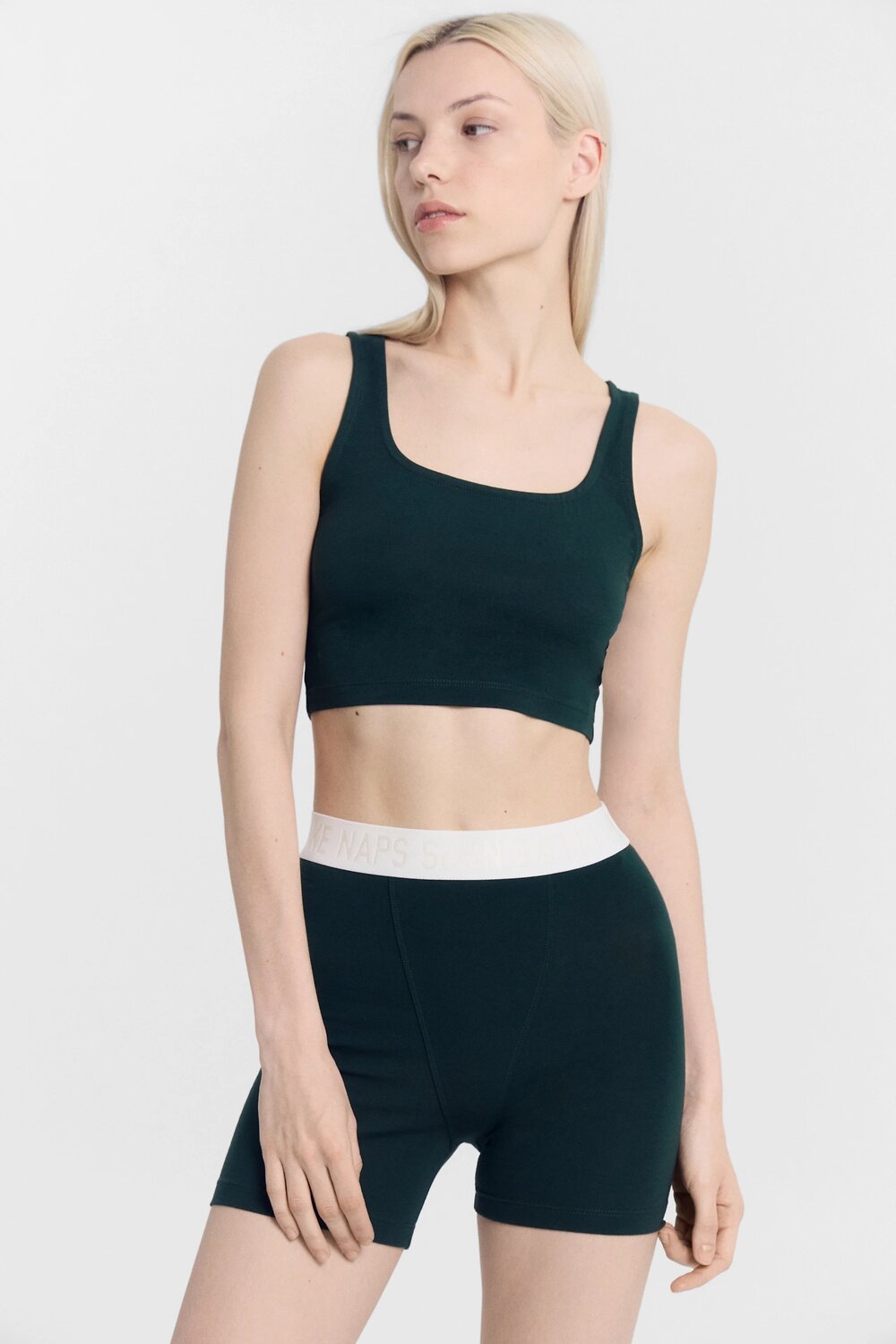 Комплект женский состоит из топа и шорт. Топ прилегающего силуэта. Перед и спинка цельнокроенные. Горловина формы каре. Горловина и проймы обработаны в чистыфй край, нижний срез обработан швом в подгибку. Шорты облегающего силуэта. По переду декоративная отрезная деталь, имитация "гульфика". По верхнему срезу настрочена жаккардовая эластичная тесьма. Нижние срезы обработаны швом вподгибку.