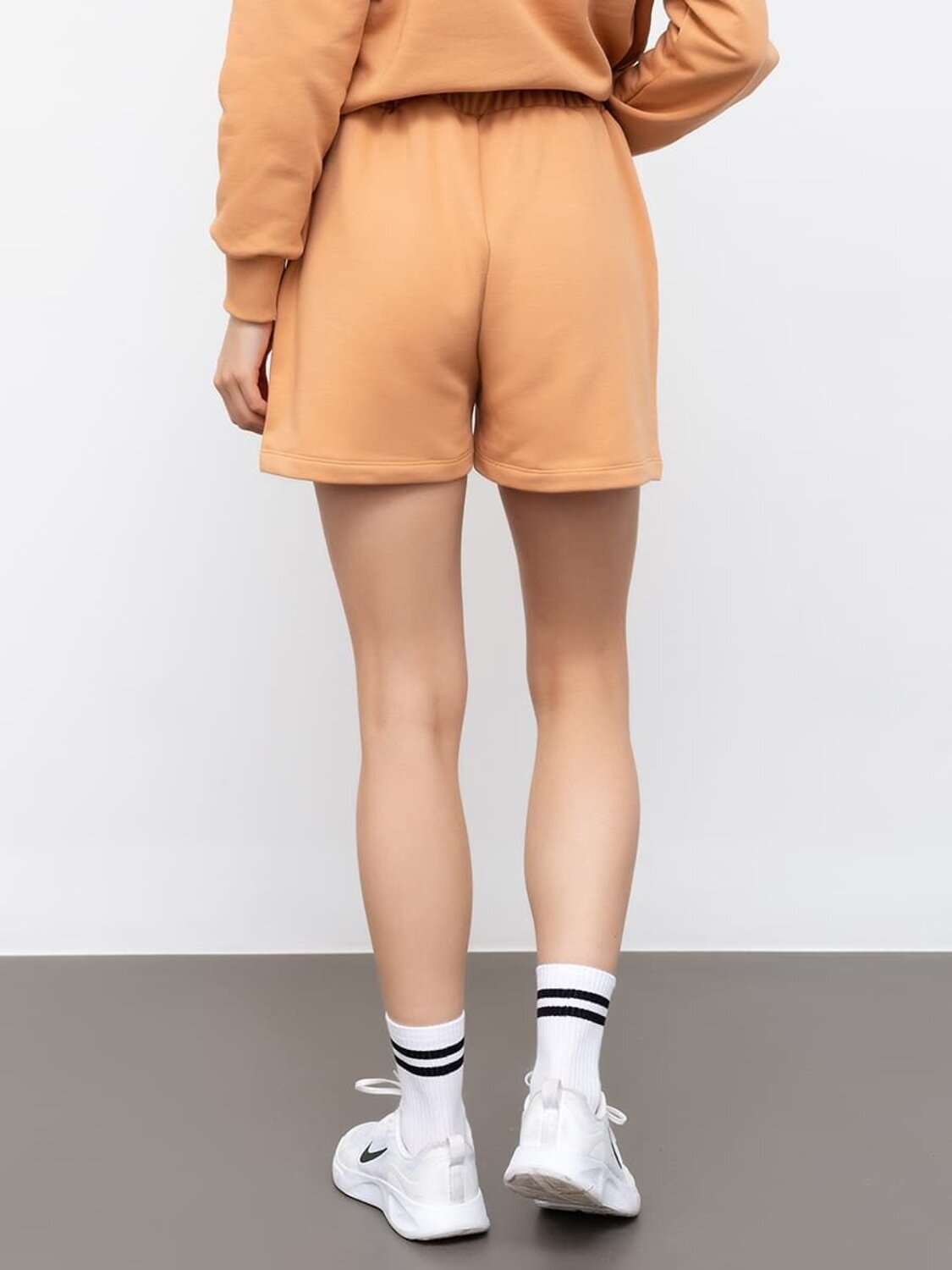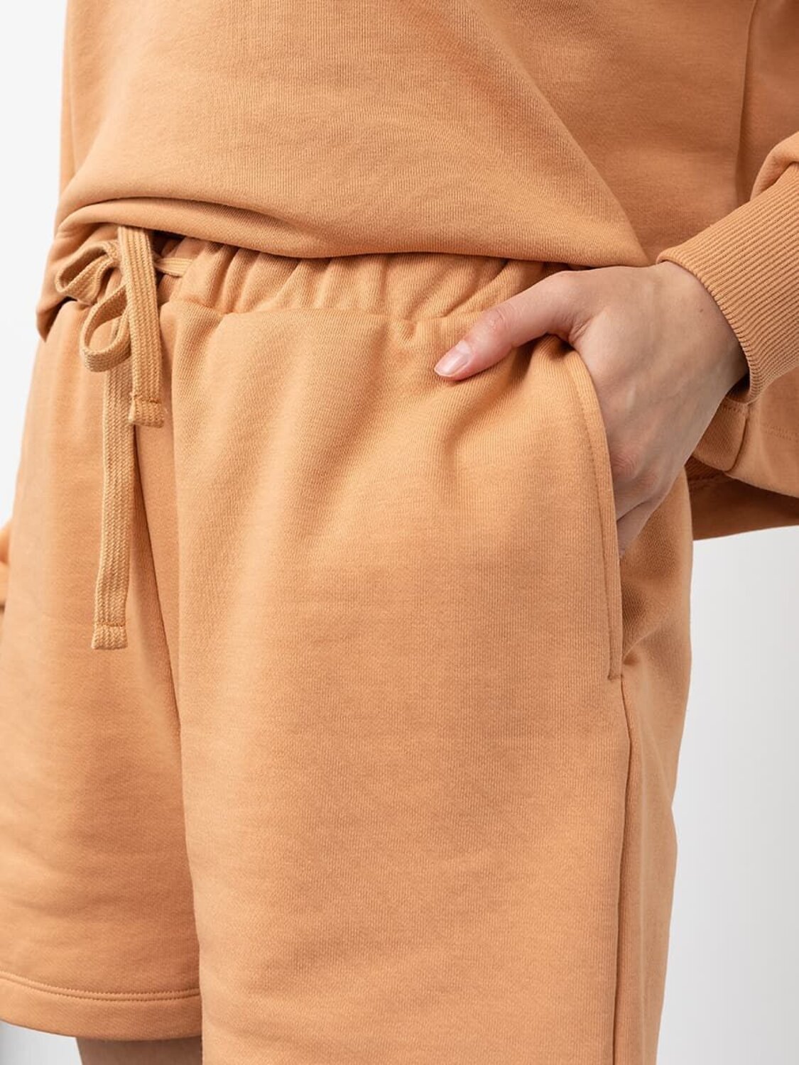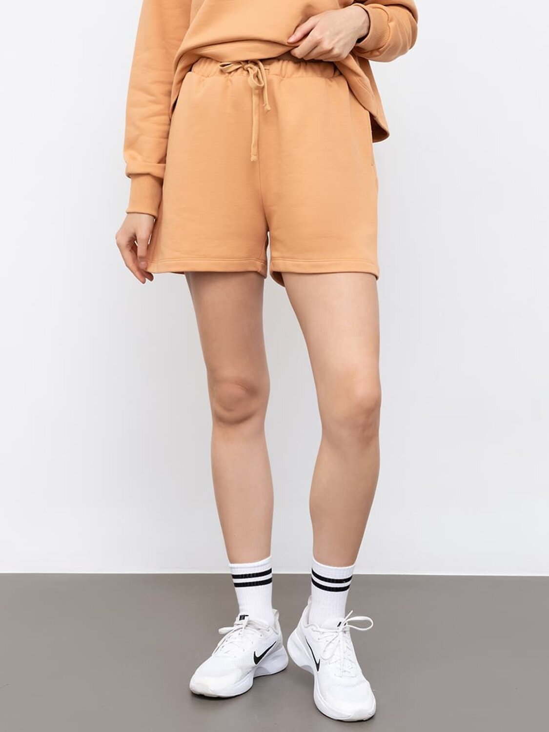 Мини-шорты свободного силуэта из легкого трикотажного футера. Высокая посадка на талии, эластичная тесьма в поясе, регулировочный шнурок-завязка и удобные боковые карманы – комфортный минимализм!