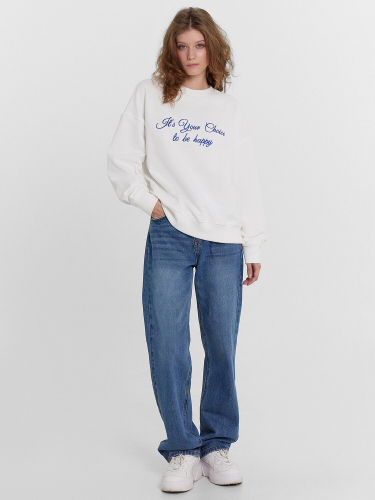 Объемный женский свитшот свободного силуэта из футера с теплым и нежным подчесом. Вырез классический, круглый. Рукава типа "реглан" со значительно спущенной линией плеча дарят особый комфорт. По низу свитшота – свободный широкий пояс из рибаны. Это тренд!