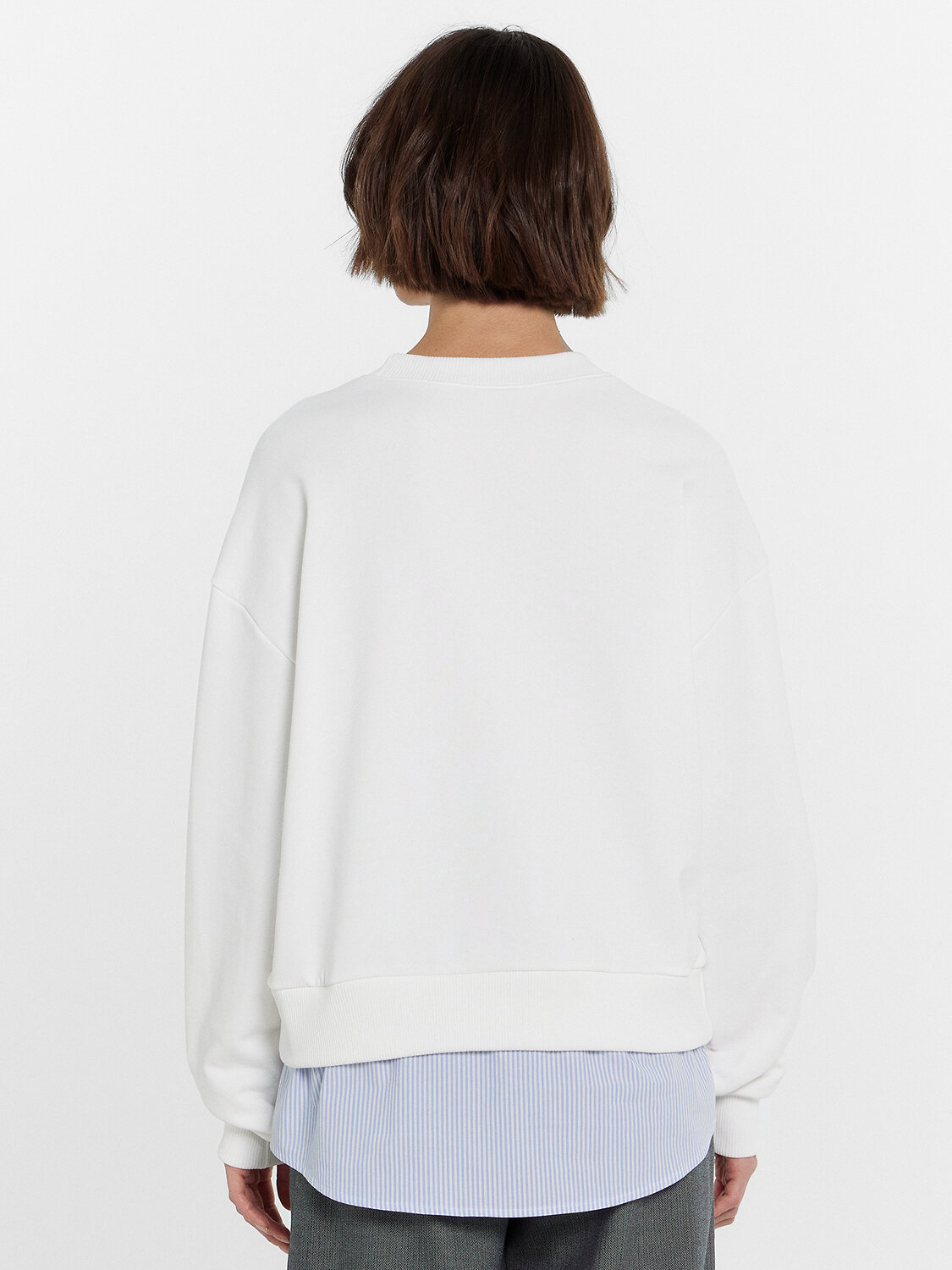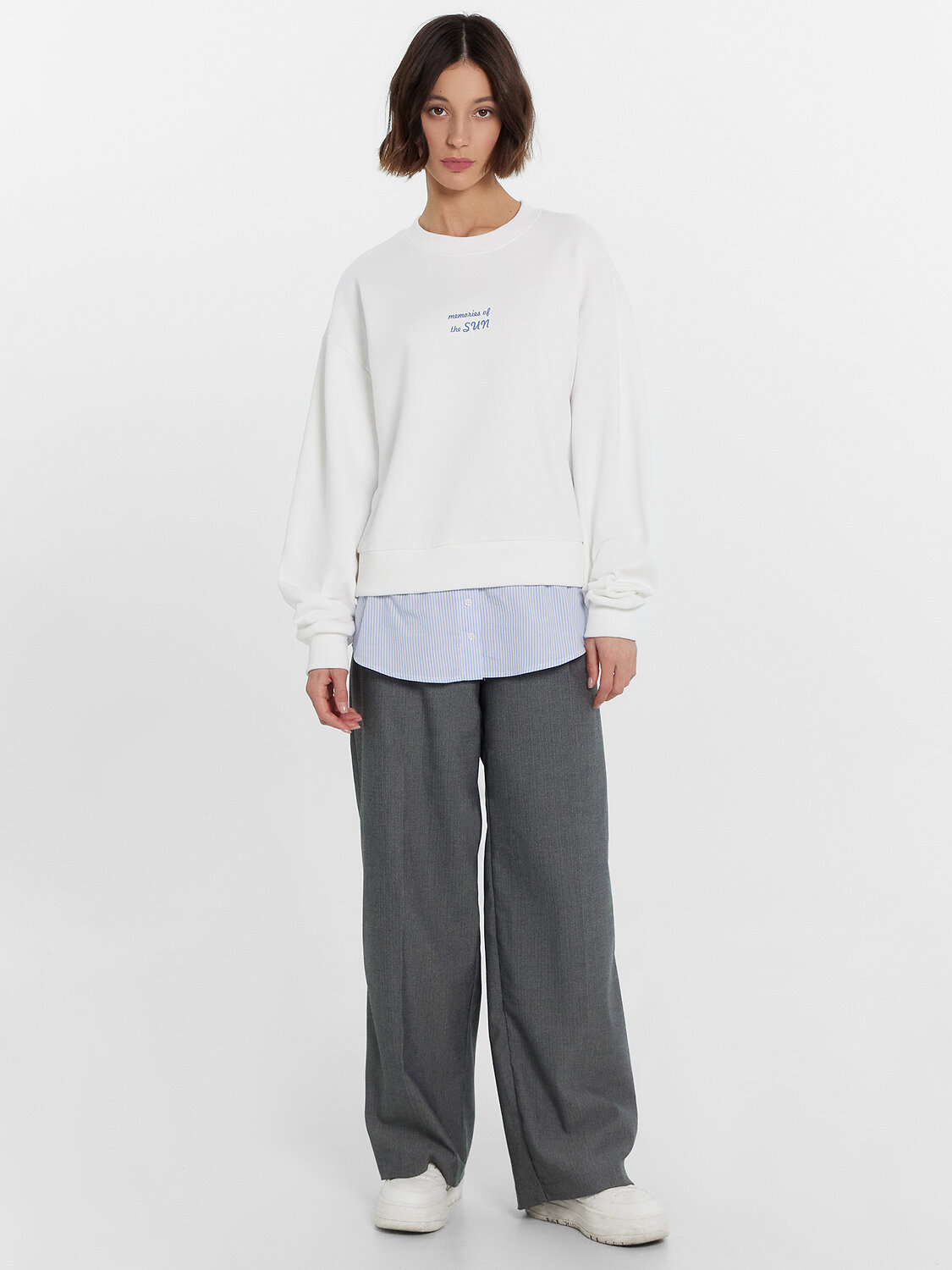 Свитшот прямого силуэта, свободный. Горловина круглой формы с обтачкой из рибаны. Рукава втачные длинные с отрезными манжетами из рибаны. Плечо спущено. По низу свитшота отрезной пояс из рибани и декоративная деталь из ткани имитирующая низ рубашки. Декоративная деталь по переду с застежкой на петли и пуговицы (на 4 прокола, d 10мм). Нижний срез фигурный.