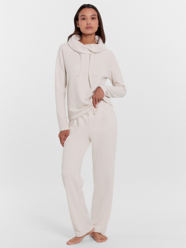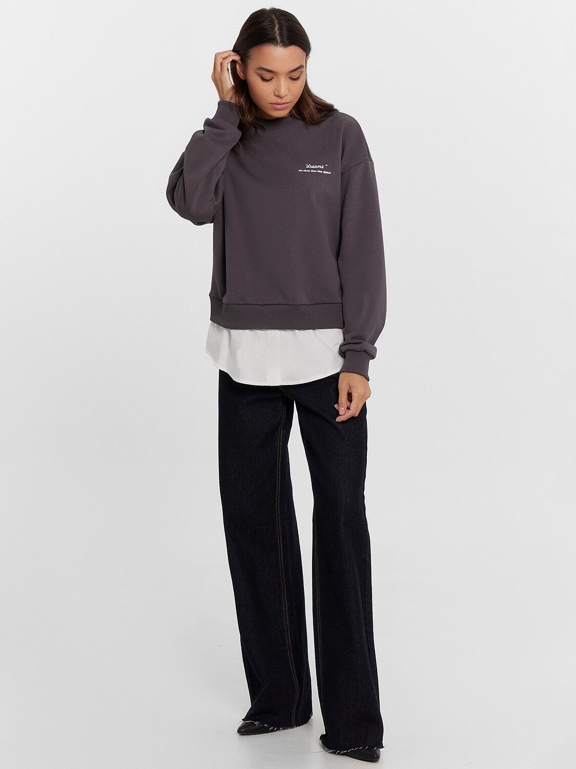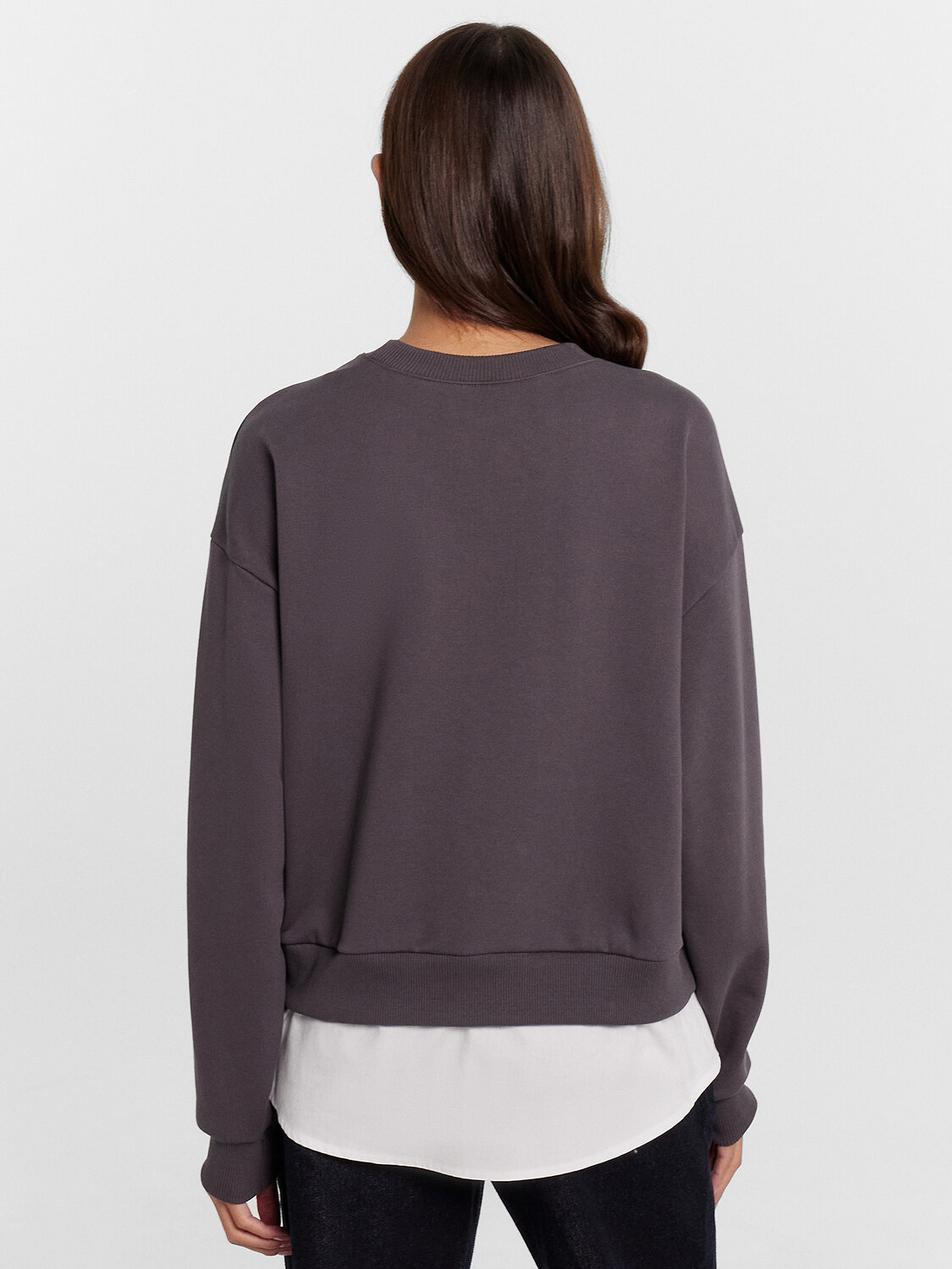 Свитшот прямого силуэта, свободный. Горловина круглой формы с обтачкой из рибаны. Рукава втачные длинные с отрезными манжетами из рибаны. Плечо спущено. По низу свитшота отрезной пояс из рибани и декоративная деталь из ткани имитирующая низ рубашки. Декоративная деталь по переду с застежкой на петли и пуговицы (на 4 прокола, d 10мм). Нижний срез фигурный.