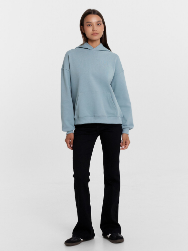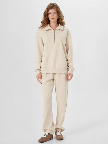 Женская толстовка прямого силуэта выполнена из интерлока — мягкого, плотного трикотажного материала, который хорошо держит форму и обеспечивает комфорт в носке. Свободный крой не ограничивает движения и подходит для любого типа фигуры. Спереди расположена декоративная деталь, плавно переходящая в воротник-стойку из рибаны, что придает изделию оригинальность и дополнительную защиту от ветра. Центральная застежка на молнию делает модель удобной и практичной. Длинные рукава дополнены манжетами из рибаны, а спущенная линия плеча подчеркивает расслабленный стиль. По низу толстовка оформлена поясом из рибаны, который аккуратно фиксирует изделие и завершает образ. Такая модель идеально подойдёт для повседневной носки, прогулок или отдыха, сочетая в себе уют, стиль и функциональность.