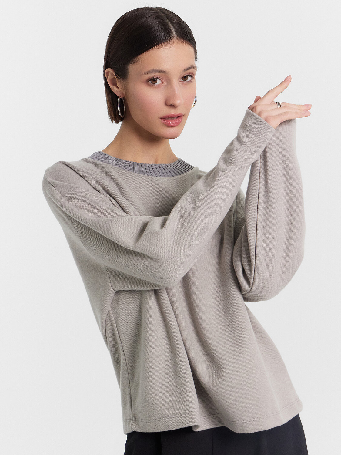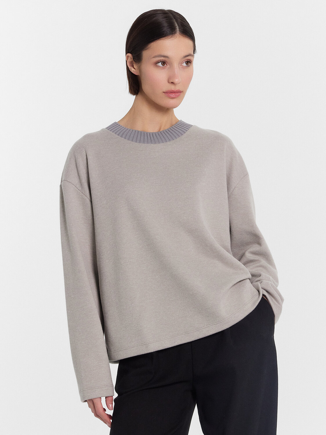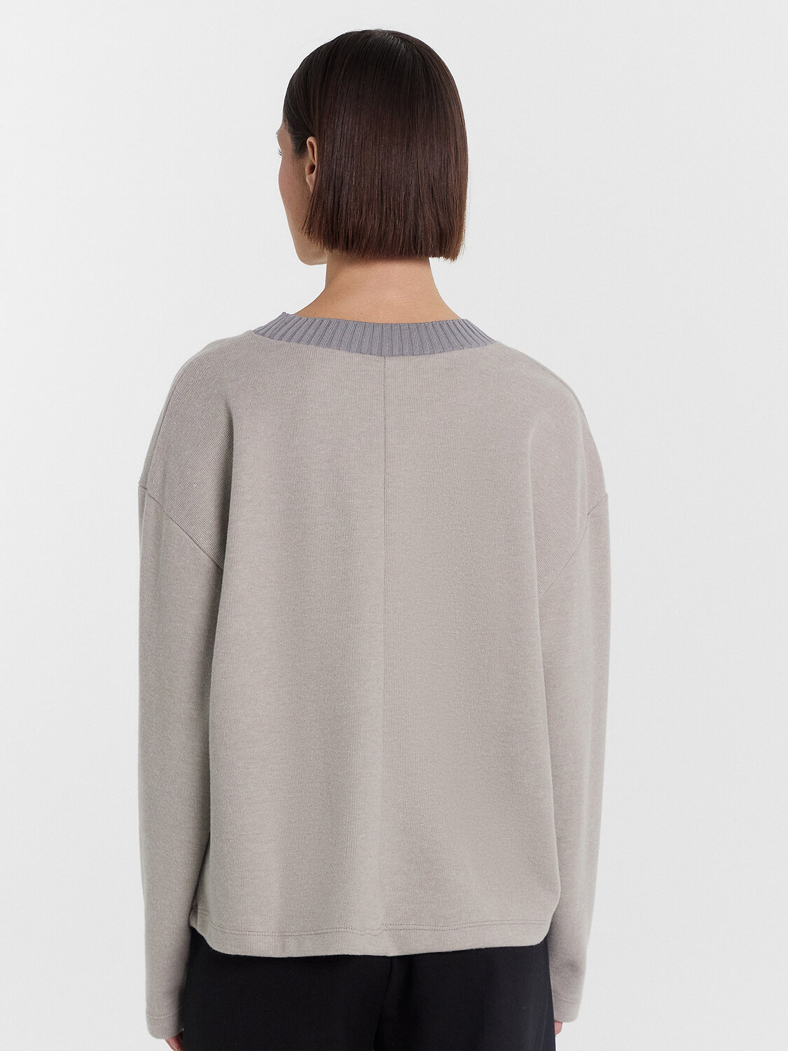 Свитшот свободный, укороченный. Горловина круглой формы, обработана обтачкой из довяза 3*3 (DOC40/195-0/4). Перед цельнокроеный, спинка со средним швом. Рукава втачные длинные, плечо спущено. Нижние срезы обработаны швом вподгибку.