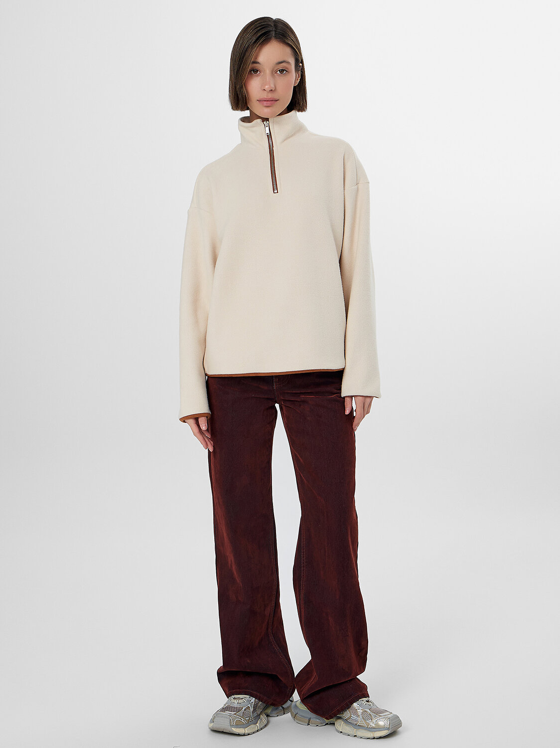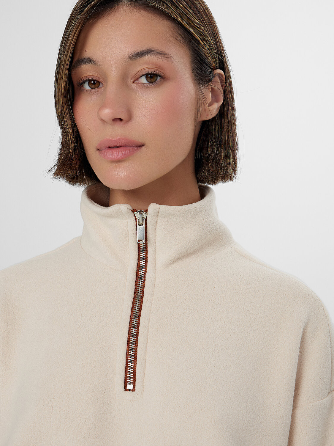 Женская толстовка из мягкого флиса станет уютным дополнением вашего гардероба. Свободный крой с круглой горловиной и стойкой обеспечивает комфорт в течение всего дня. Застежка-молния по центру и мягкие спущенные плечи создают расслабленный силуэт, не сковывающий движений.