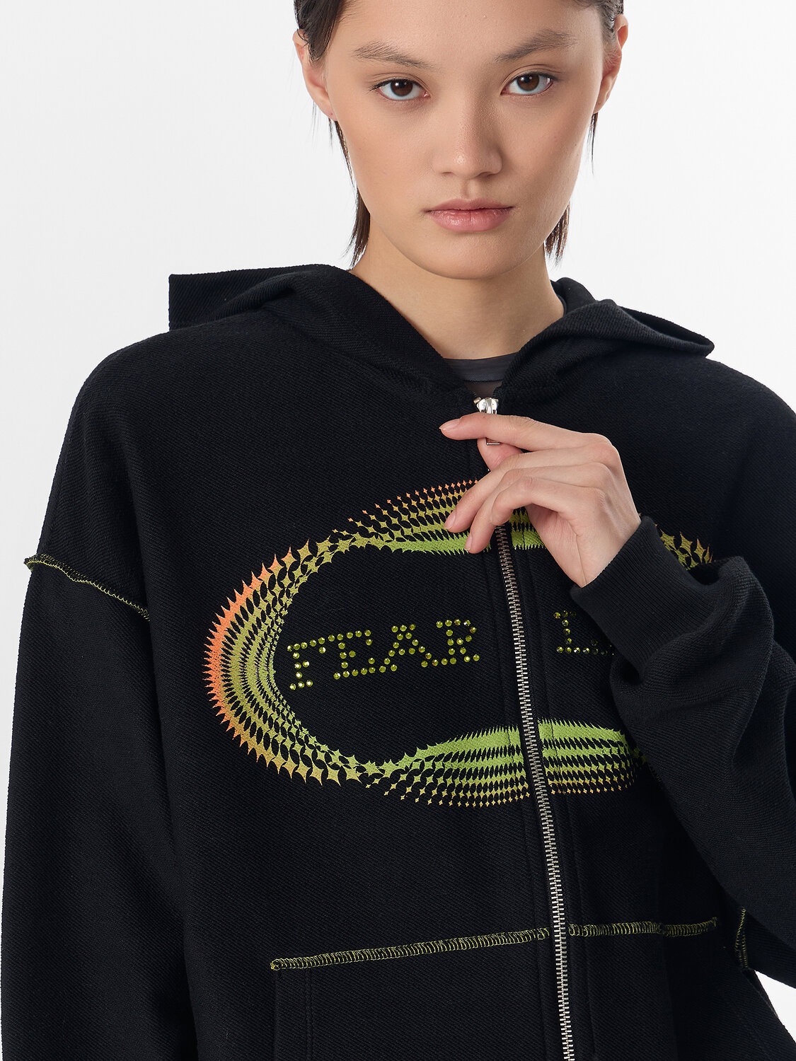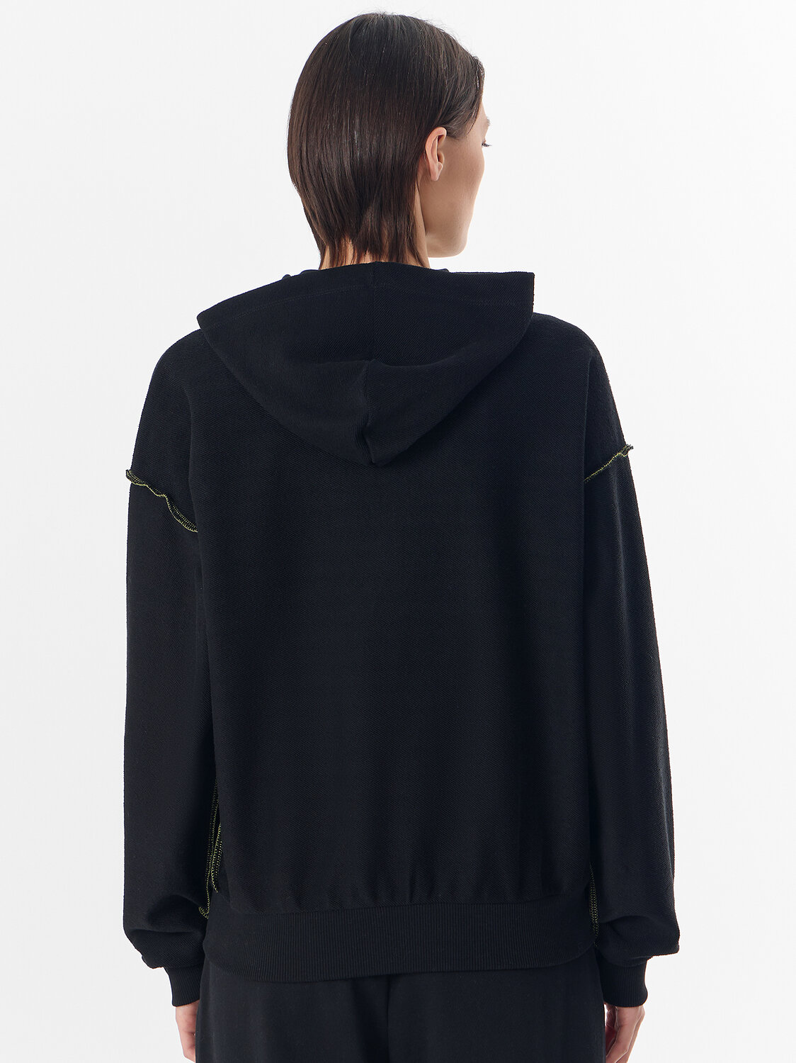 Свободный крой со спущенным плечом и цельнокроеными деталями обеспечивает полную свободу движений. Практичные элементы — эластичные манжеты и пояс из рибаны, удобная центральная молния и вместительные карманы — делают толстовку функциональной для активного дня.