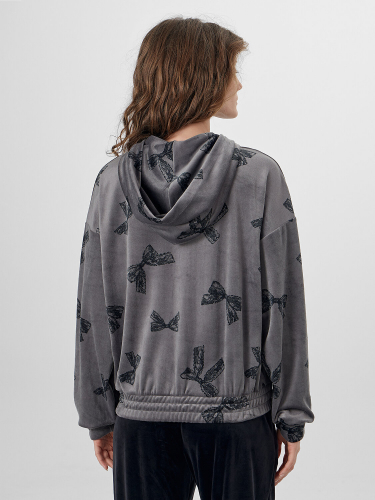 Манжеты на рукавах и пояс по низу, дополненные декоративными строчками, обеспечивают аккуратную посадку. Внутренние швы горловины обработаны мягкой хлопковой тесьмой для приятных тактильных ощущений. Велюровый материал с добавлением эластана мягко тянется и дарит нежность при каждом движении. Эта толстовка станет любимым предметом гардероба для спокойных вечеров и утреннего отдыха.