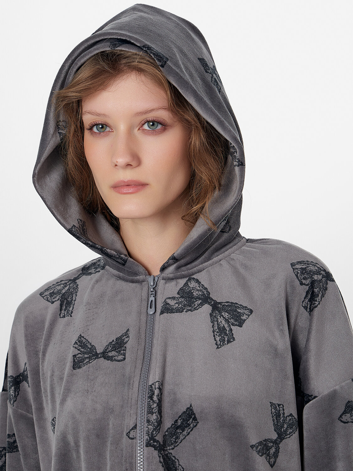 Женская домашняя толстовка из мягкого велюра — это воплощение уюта и расслабленного стиля. Модель свободного кроя с мягким капюшоном и удобной молнией создает ощущение комфорта и расслабленности. Элегантный велюр с добавлением эластана нежно обволакивает фигуру, сохраняя тепло и даря приятные тактильные ощущения.