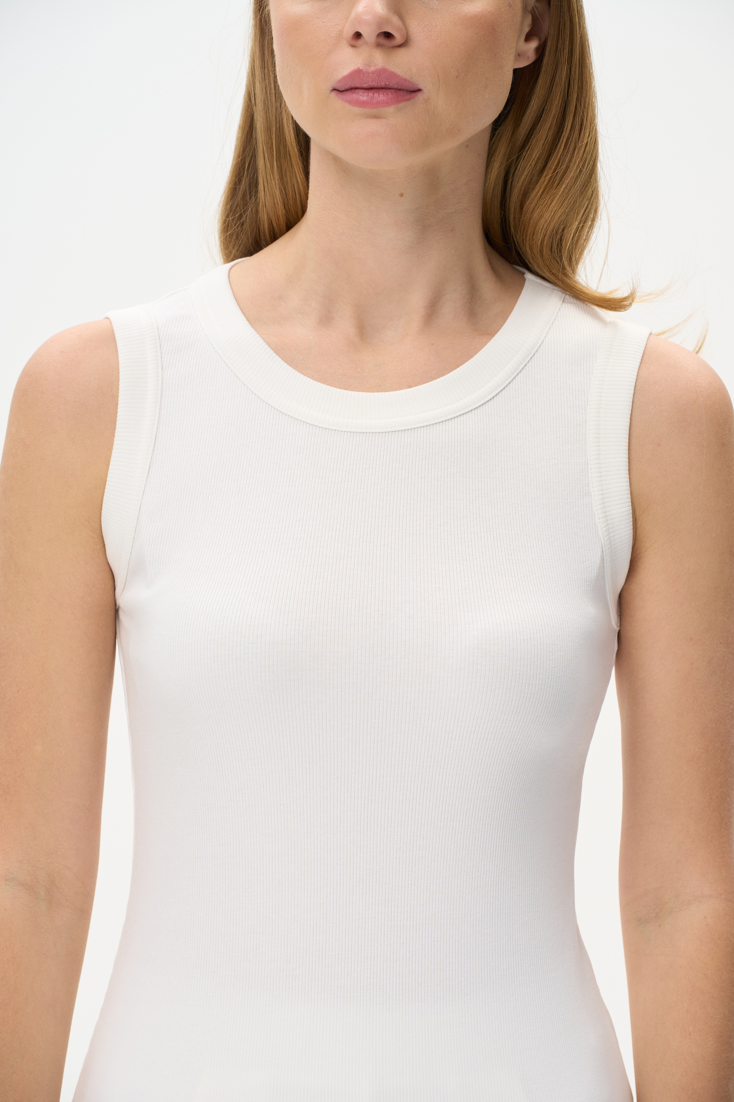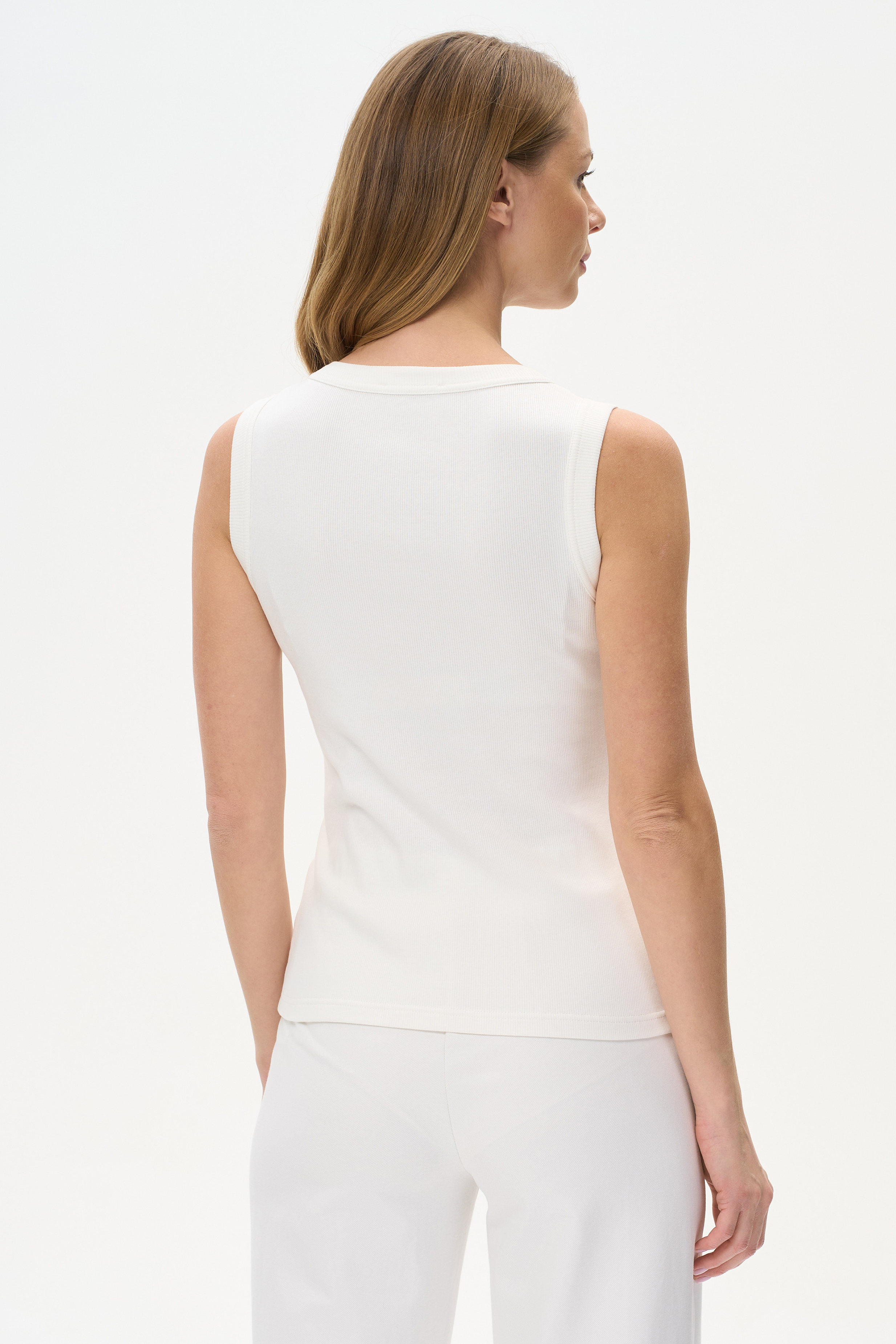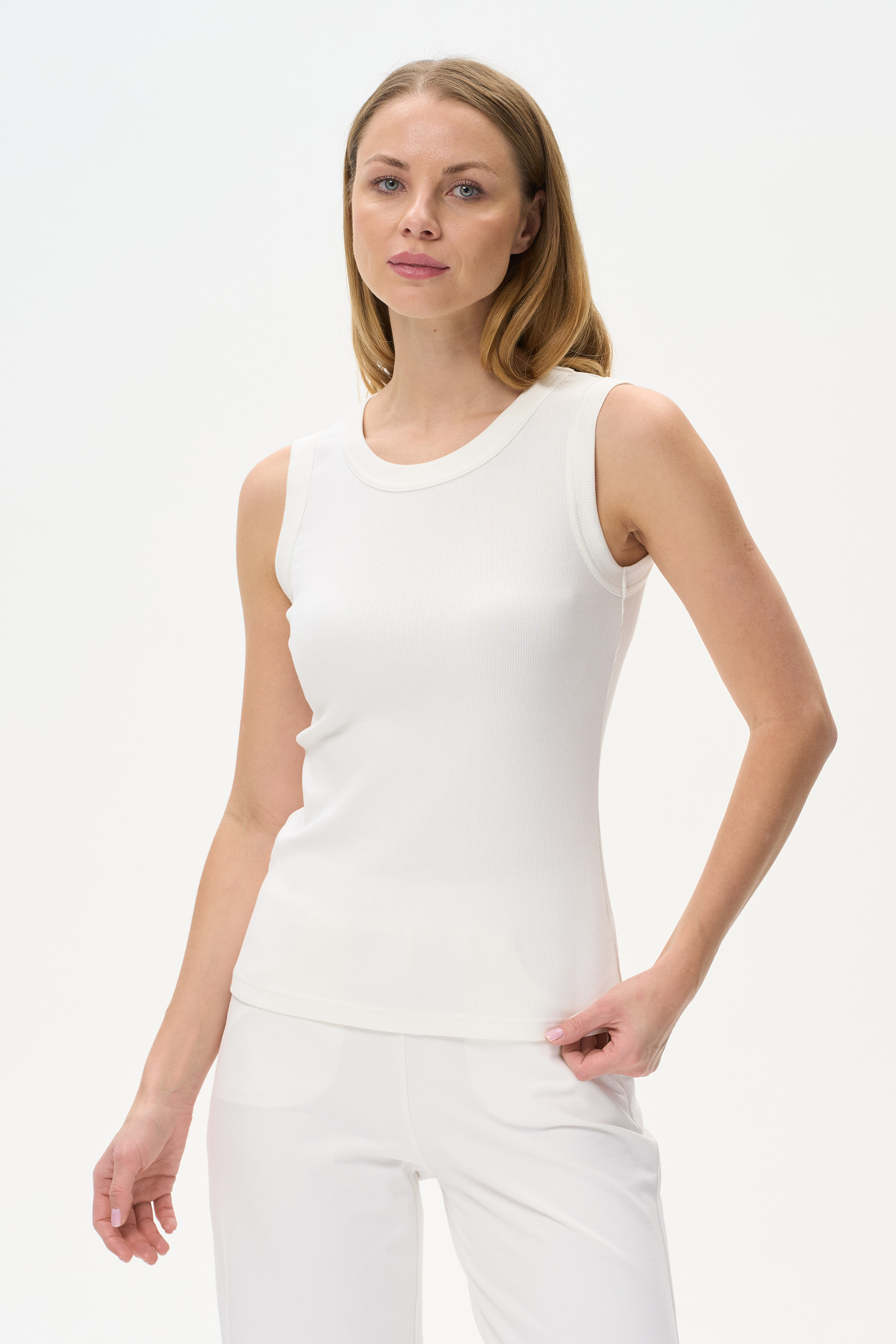 Топ выполнен из хлопкового трикотажного полотна с эластаном - кашкорсе. Модного прилегающего силуэта. Круглый вырез горловины и завышенные проймы обработаны широкой планкой. Рост модели на фото 178см.