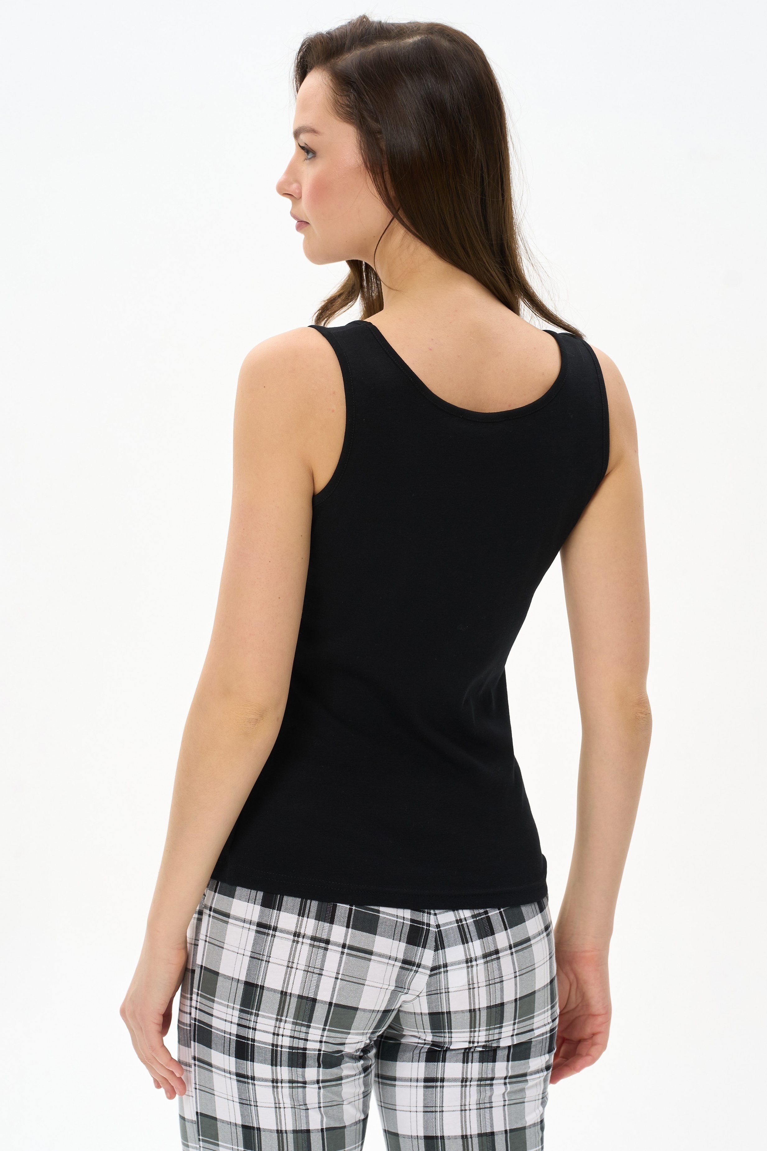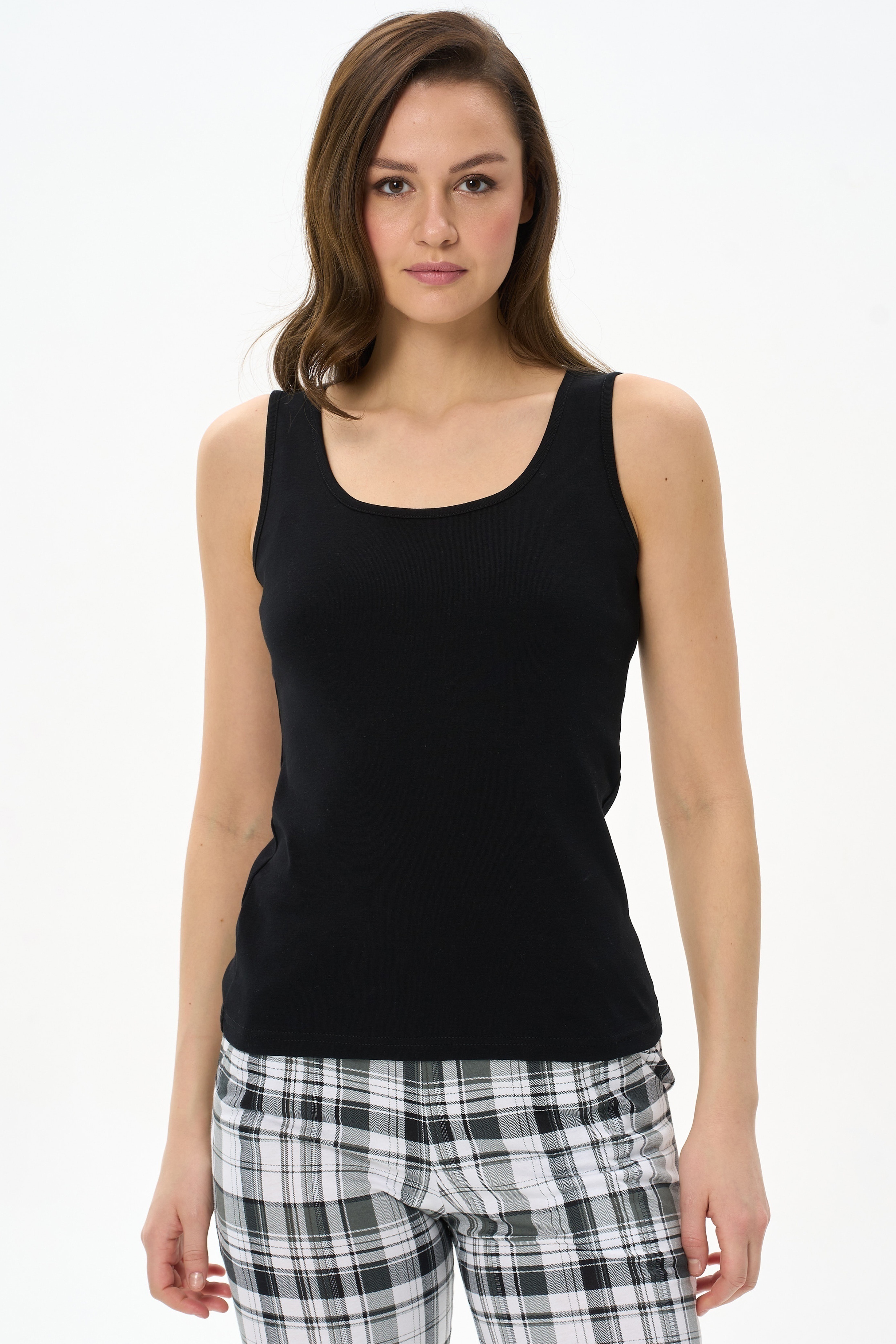 Комфортная майка из хлопкового трикотажного полотна рибана. Вырез горловины и проймы окантованы. Рост модели на фото 178 см.