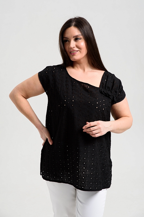 Майка женская, свободная, горловина асимметричная, нижняя часть левой кокетки полочки собрана, образуя рюшу. В боковых швах разрезы. Легкая, оригинальная майка их х/б ткани хорошее дополнение вашего летнего гардероба.