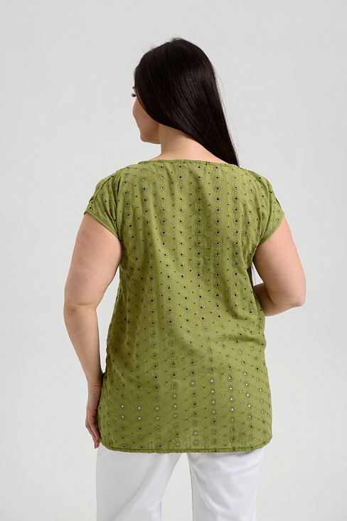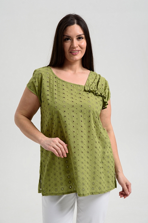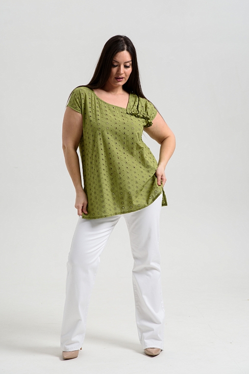 Майка женская, свободная, горловина асимметричная, нижняя часть левой кокетки полочки собрана, образуя рюшу. В боковых швах разрезы. Легкая, оригинальная майка их х/б ткани хорошее дополнение вашего летнего гардероба.