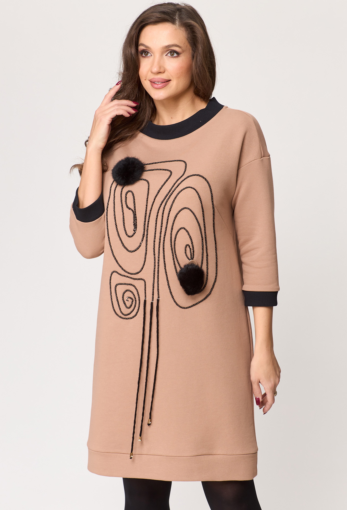 Женское трикотажное платье выполнено из футера 3-х нитка, для повседневной носки станет одним из базовых и любимых изделий в Вашем гардеробе. Платье прямого полуприлегающего силуэта, длиной до колена, однотонное с контрастными манжетами из довяза и планкой горловины. Вырез горловины круглый, рукав втачной длиной 3/4. Украшением платья служит контрастная вышивка из шнура и пристегивающиеся меховые пушки.