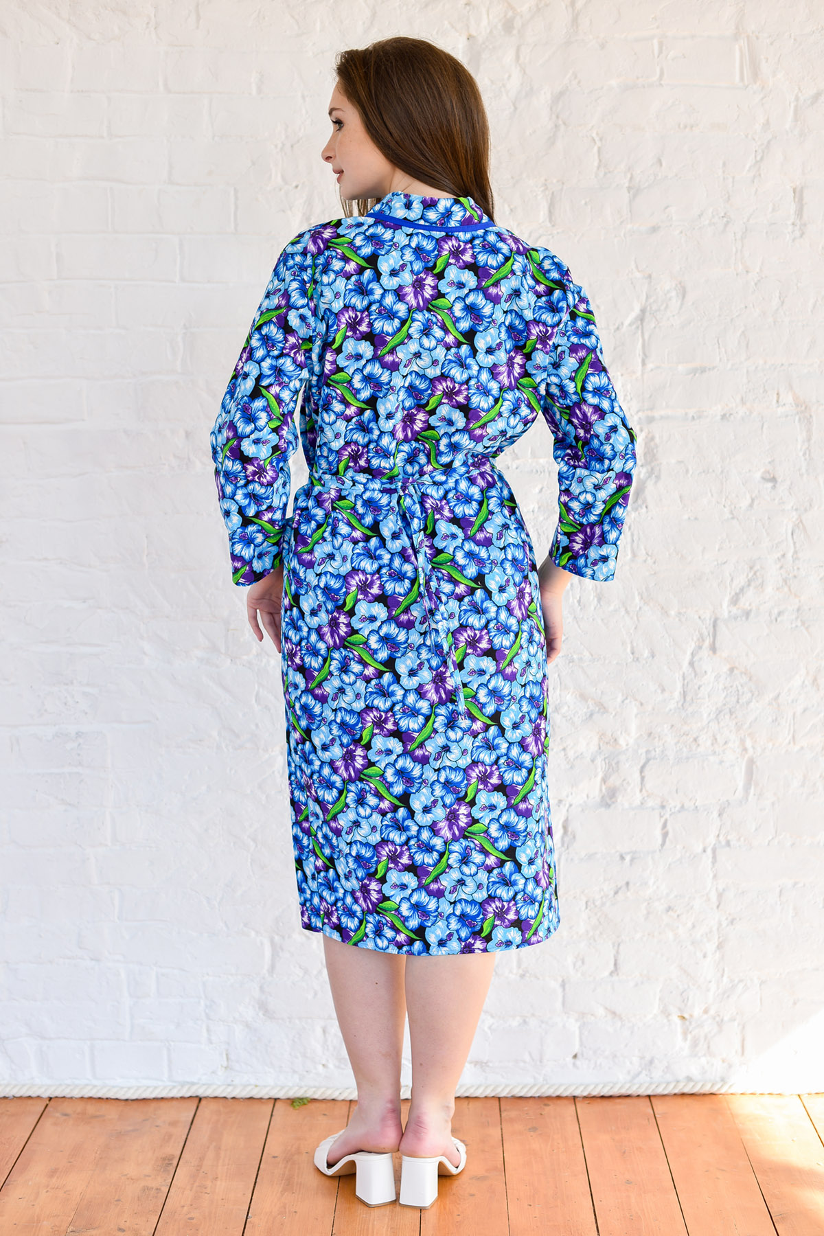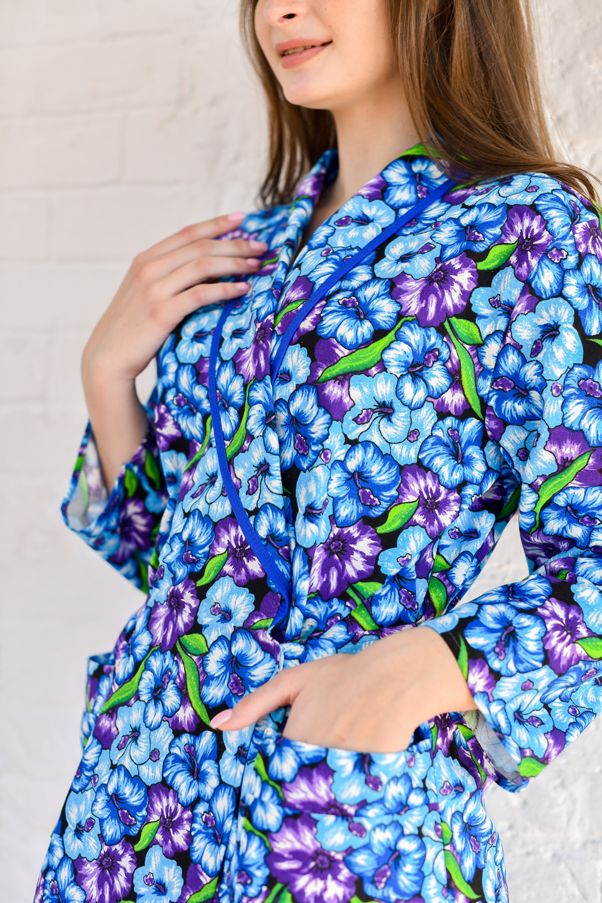Халат женский запашной с воротником-шаль, притачным поясом по линии талии и двумя боковыми карманами. Рукав втачной, длинный.