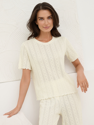 Женский домашний комплект: свободная футболка с коротким рукавом и круглым вырезом и прямые брюки без карманов с резинкой на поясе.
