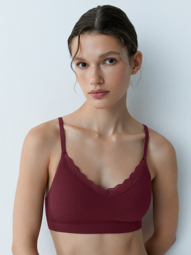 Комфортный топ в рубчик на тонких регулируемых бретелях со съемными формованными вкладышами. Подчеркивает естественную форму груди. Верх лифа обработан ажурным кружевом с изящным цветочным рисунком.