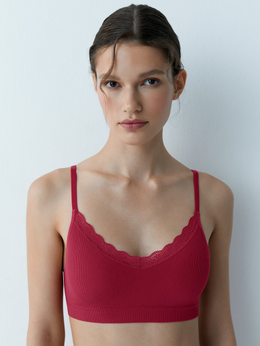 Комфортный топ в рубчик на тонких регулируемых бретелях со съемными формованными вкладышами. Подчеркивает естественную форму груди. Верх лифа обработан ажурным кружевом с изящным цветочным рисунком.