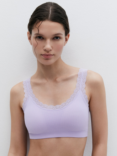 Комфортный топ в рубчик на широких кружевных бретелях со съемными формованными вкладышами. Верх лифа обработан ажурным кружевом с изящным цветочным рисунком.