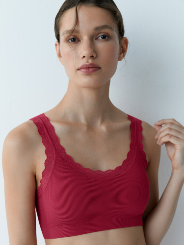 Комфортный топ в рубчик на широких кружевных бретелях со съемными формованными вкладышами. Верх лифа обработан ажурным кружевом с изящным цветочным рисунком.