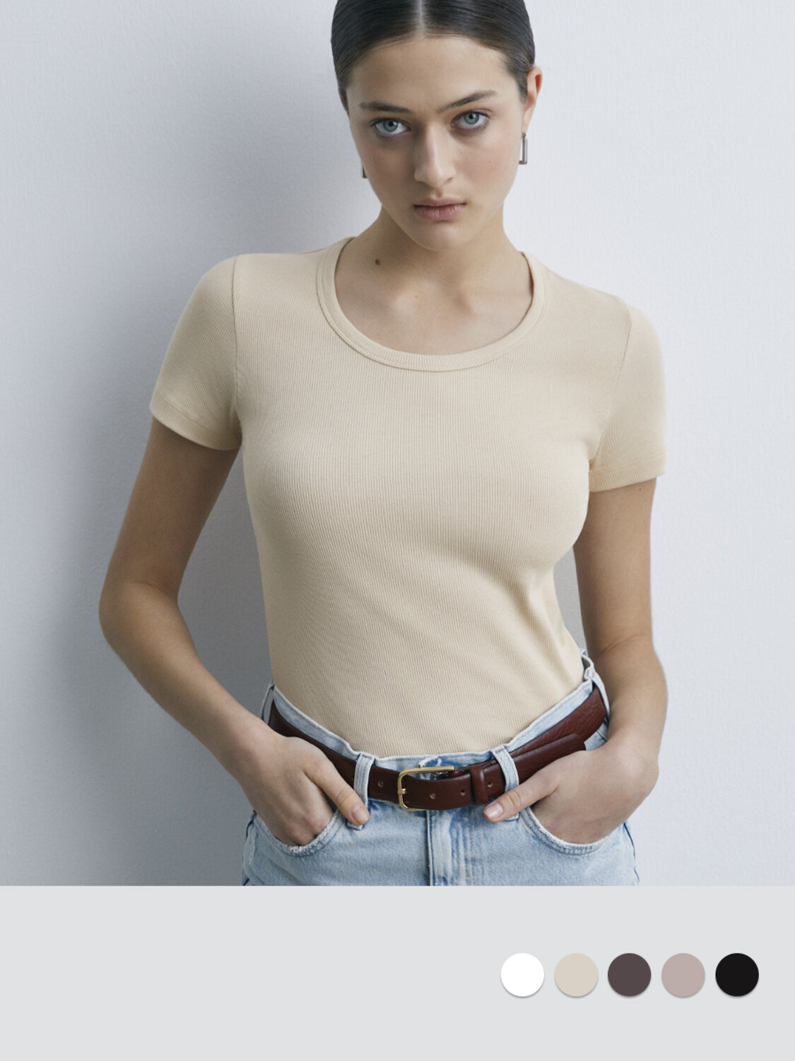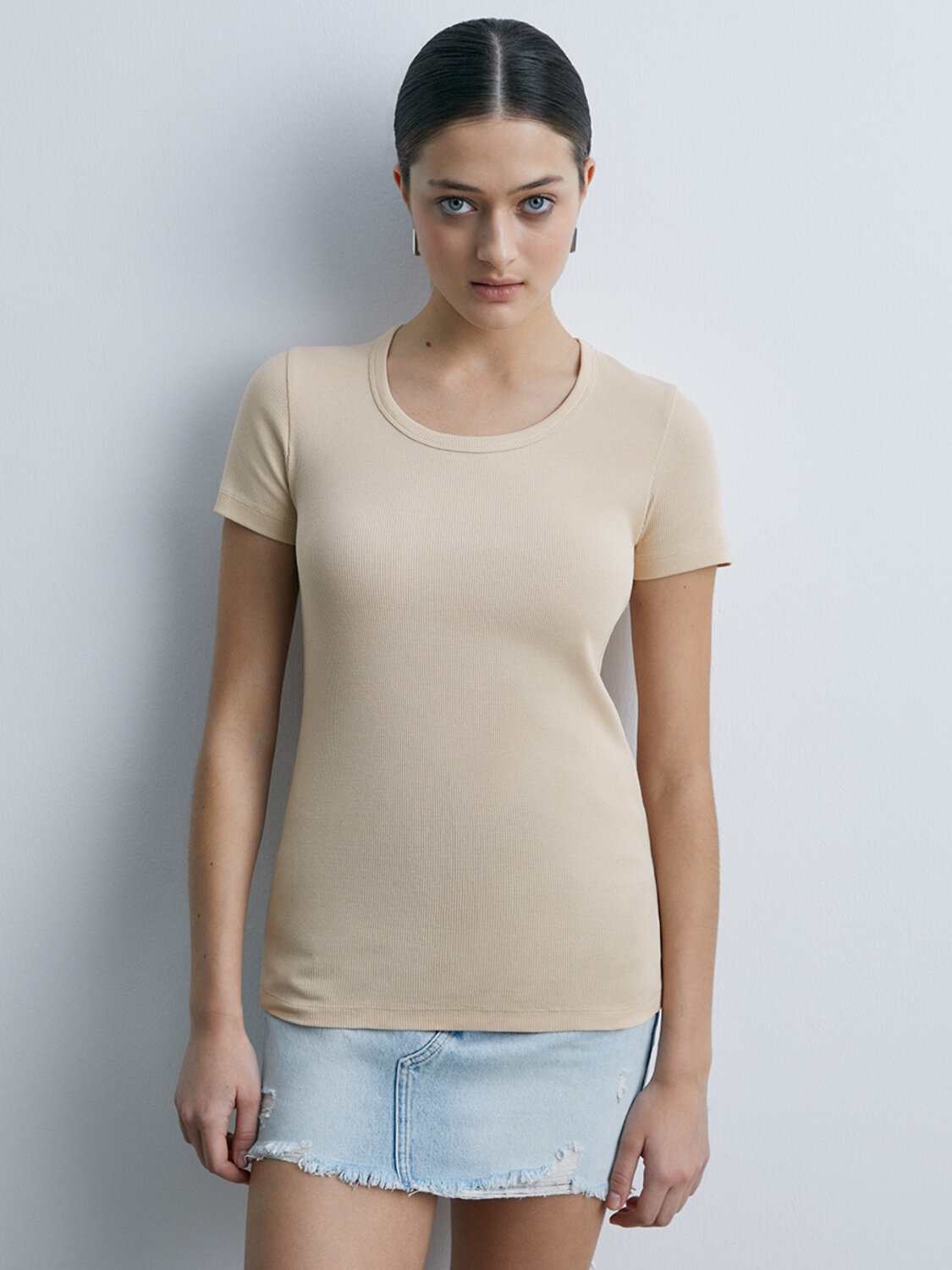 Женская футболка с коротким рукавом в рубчик из трикотажа кашкорсе с коротким рукавом и округлым глубоким вырезом горловины. Горловина окантована.