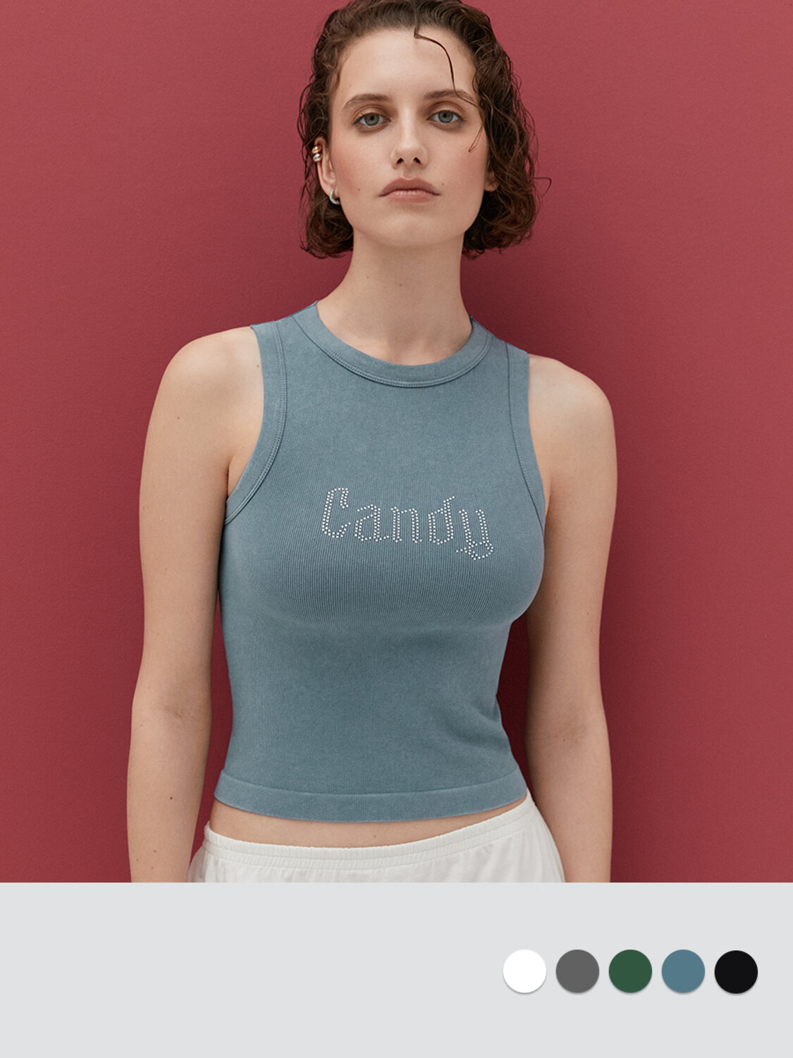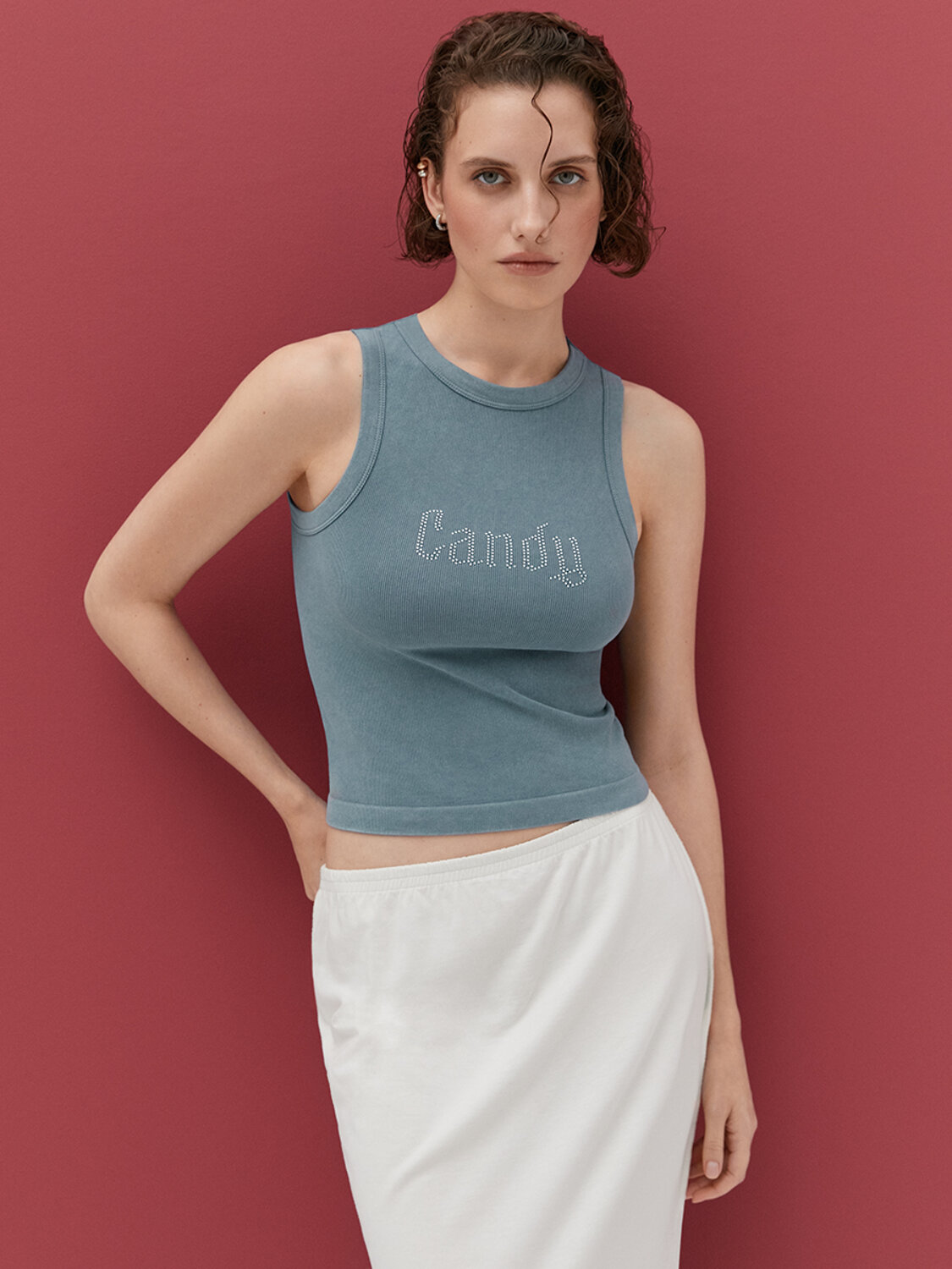 Майка с трендовым дизайном в актуальном «вареном» стиле с лаконичным акцентом в виде рисунка из страз универсально дополнит модный образ и сделает его более аутентичным и запоминающимся.