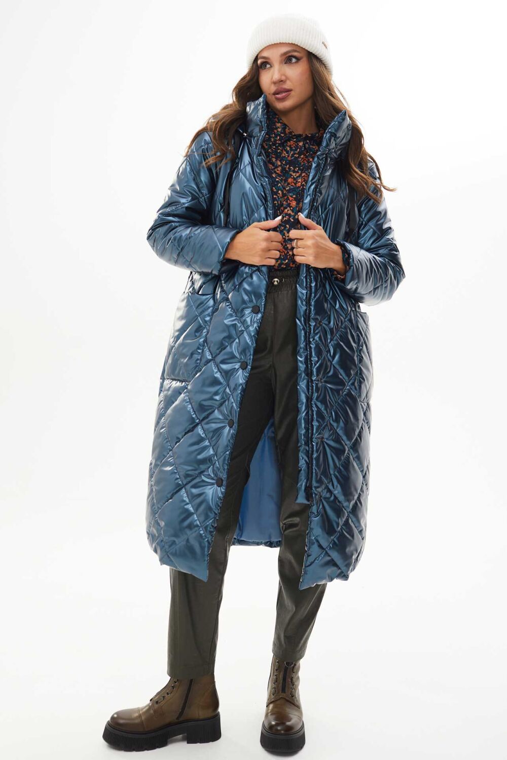 Пальто женское утеплённое осень-зима прямого силуэта с отстёгивающимся капюшоном, выполнено из ткани лаке на утеплителе изософт.  По переду большие накладные карманы и застёжка на металлические кнопки. Низ пальто стягивается на шнур. Воротник стойка. Рукава одно шовные втачные. Подкладка простёгана с утеплителем изософт (250гр)