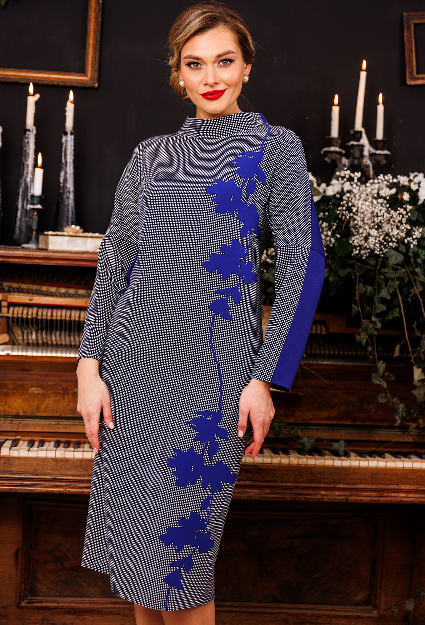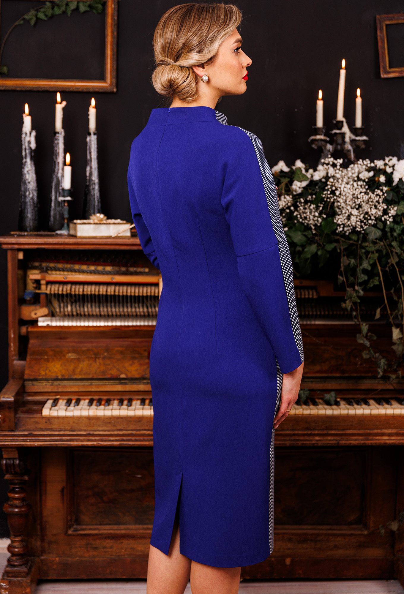 Платье полуприлегающего силуэта. Рукав цельнокройный с ластовицей. Перед с нагрудной вытачкой, выходящей из бокового шва. Спинка со средним швом и талиевыми вытачками. Застежка на тесьму-молнию в среднем шве, который переходит в шлицу. Воротник-стойка. Полочка на подкладке.