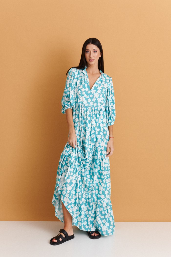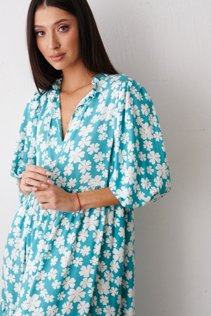 Платье прямого свободного кроя выполнено из полотна с цветочным принтом белые цветы на бирюзовом фоне.