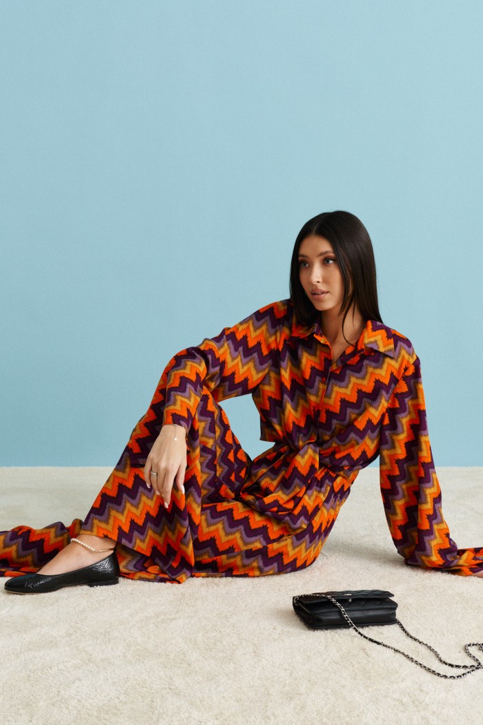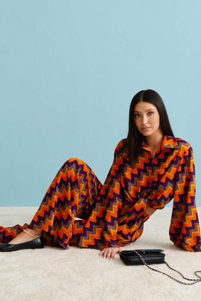 Яркий насыщенный комплект состоит из рубашки и брюк, выполнен из струящегося полотна с ярким принтом.