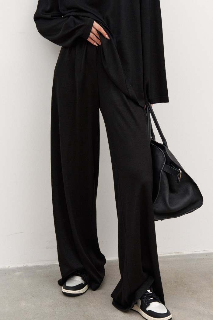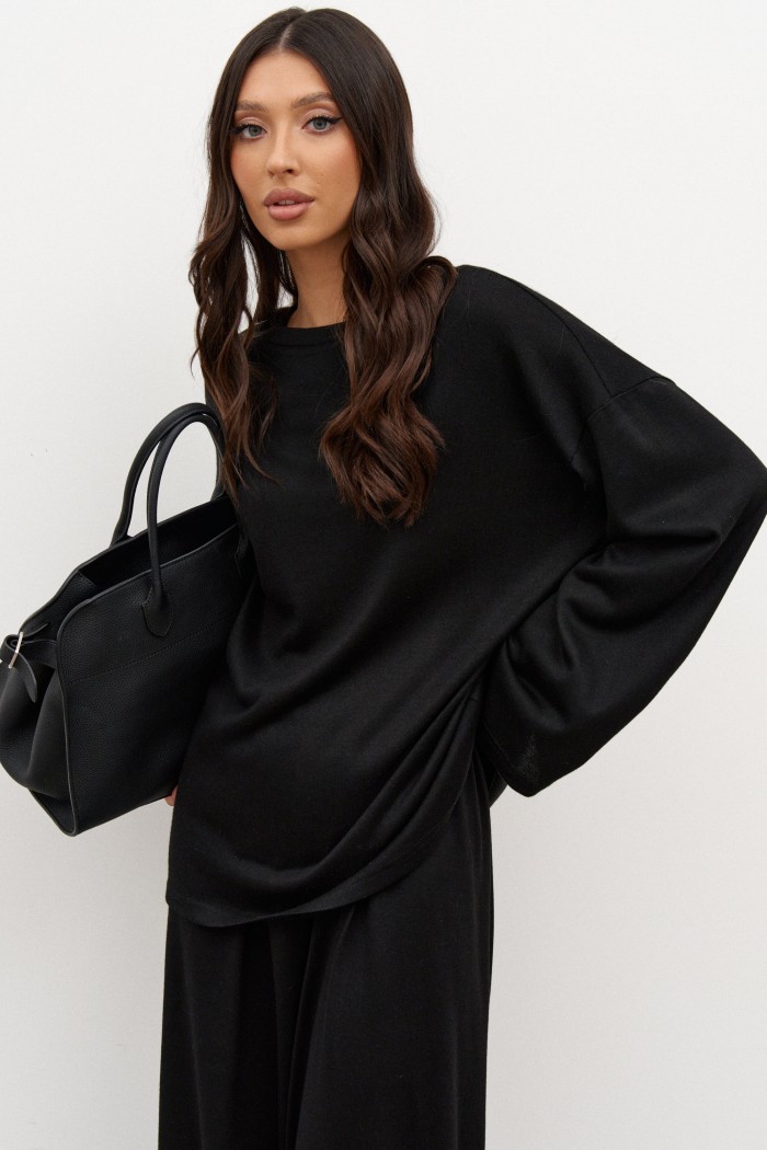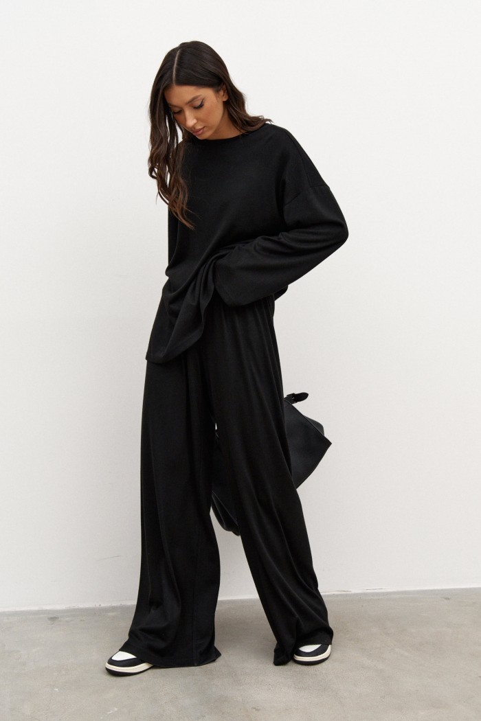 Комплект состоит из джепера и брюк выполнен из трикотажного полотна черного цвета. Характеристики: джемпер прямого свободного кроя, овальный широкий вырез горловины, рукав спущен. Длина по спинке 73 см, длина рукава от края горловины 77 см. Брюки прямого, свободного кроя, пояс брюк на резинке. Длина брюк - 112 см.