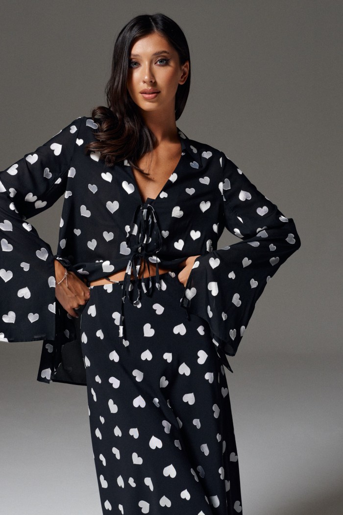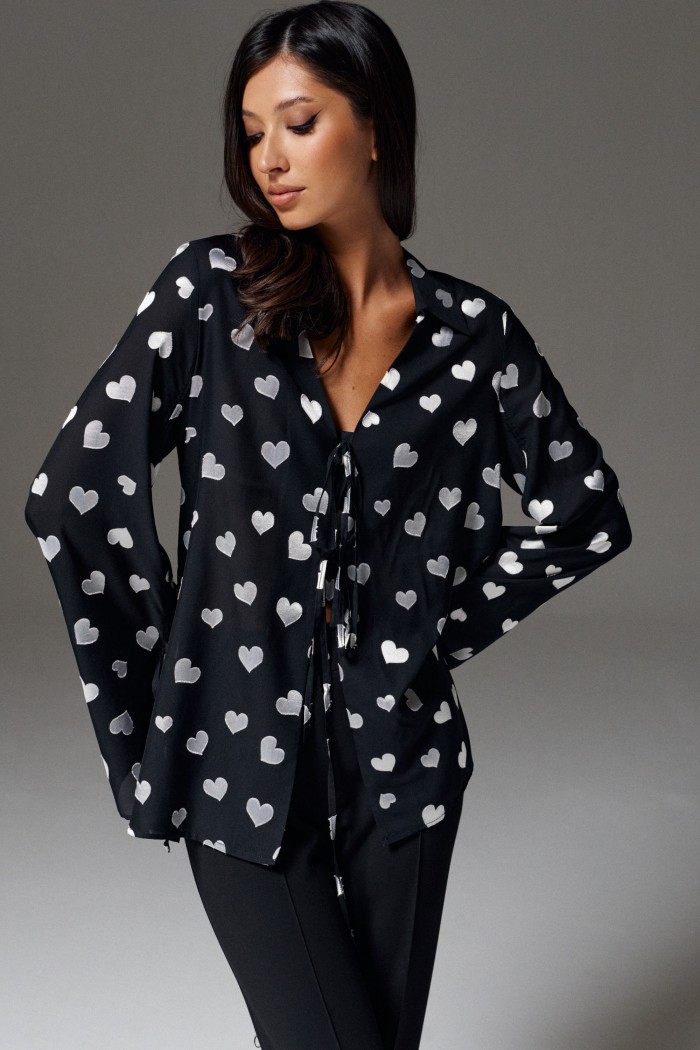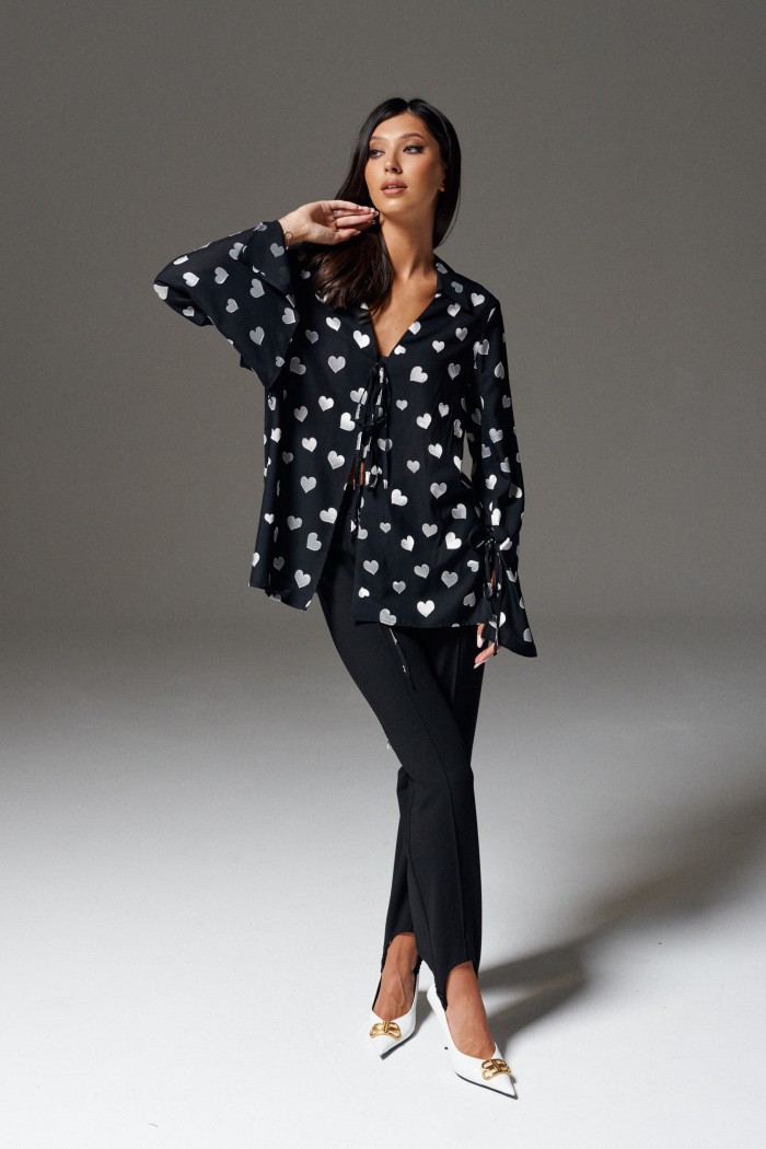 Блуза прямого свободного кроя выполнена из тонкого полотна черного цвета с фактурными белыми сердцами.